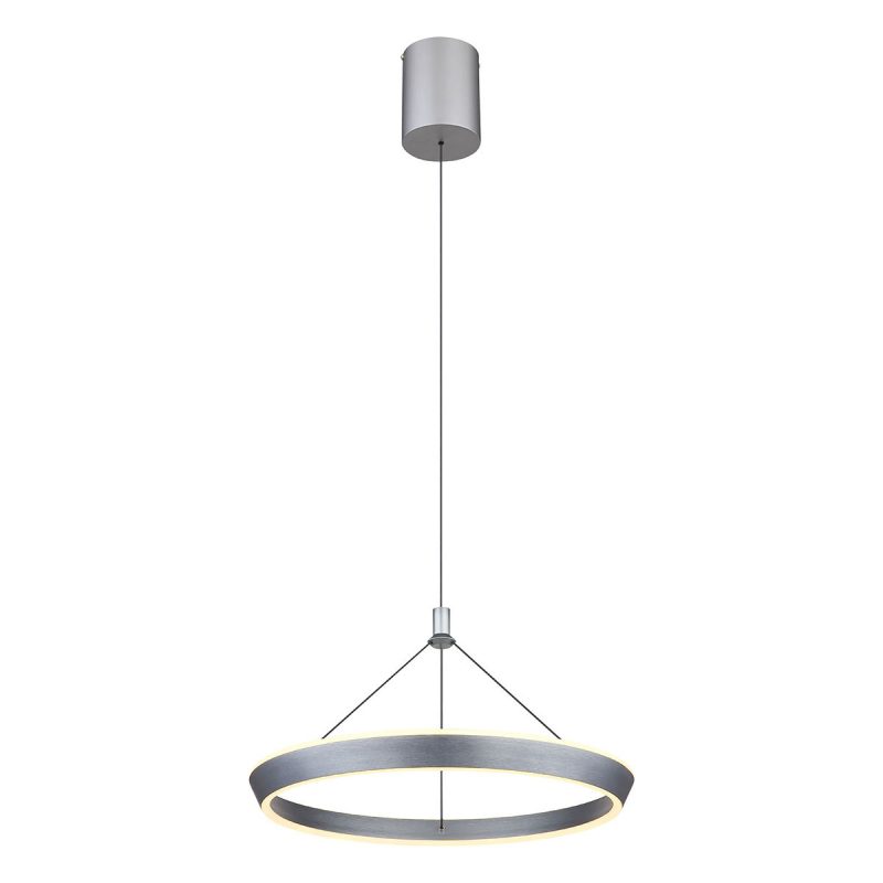 Mit ihrem stilvollen und eleganten Design wird die runde Ringhängelampe FERRA schnell zum Blickfang in jedem Raum. Hergestellt aus mattem grauem Metall und ausgestattet mit einem Schirm aus gebürstetem Aluminium in Titanfarbe und opalem Silikon, bietet diese Hängeleuchte eine ideale Kombination aus Design und Funktionalität. Mit einem Durchmesser von 500 mm ist sie besonders gut für mittelgroße bis große Räume geeignet. Die Ferra Hängeleuchte strahlt ein helles und warmes Licht mit einem Lichtstrom von 1000 und einer Farbtemperatur von 3000K aus. Darüber hinaus sorgt der opale Silikonschirm für eine gleichmäßige Lichtverteilung, wodurch Blendung vermieden wird. Ideal über einem Esstisch, im Wohnzimmer oder im Büro, schafft diese Lampe eine einladende und stilvolle Atmosphäre.
