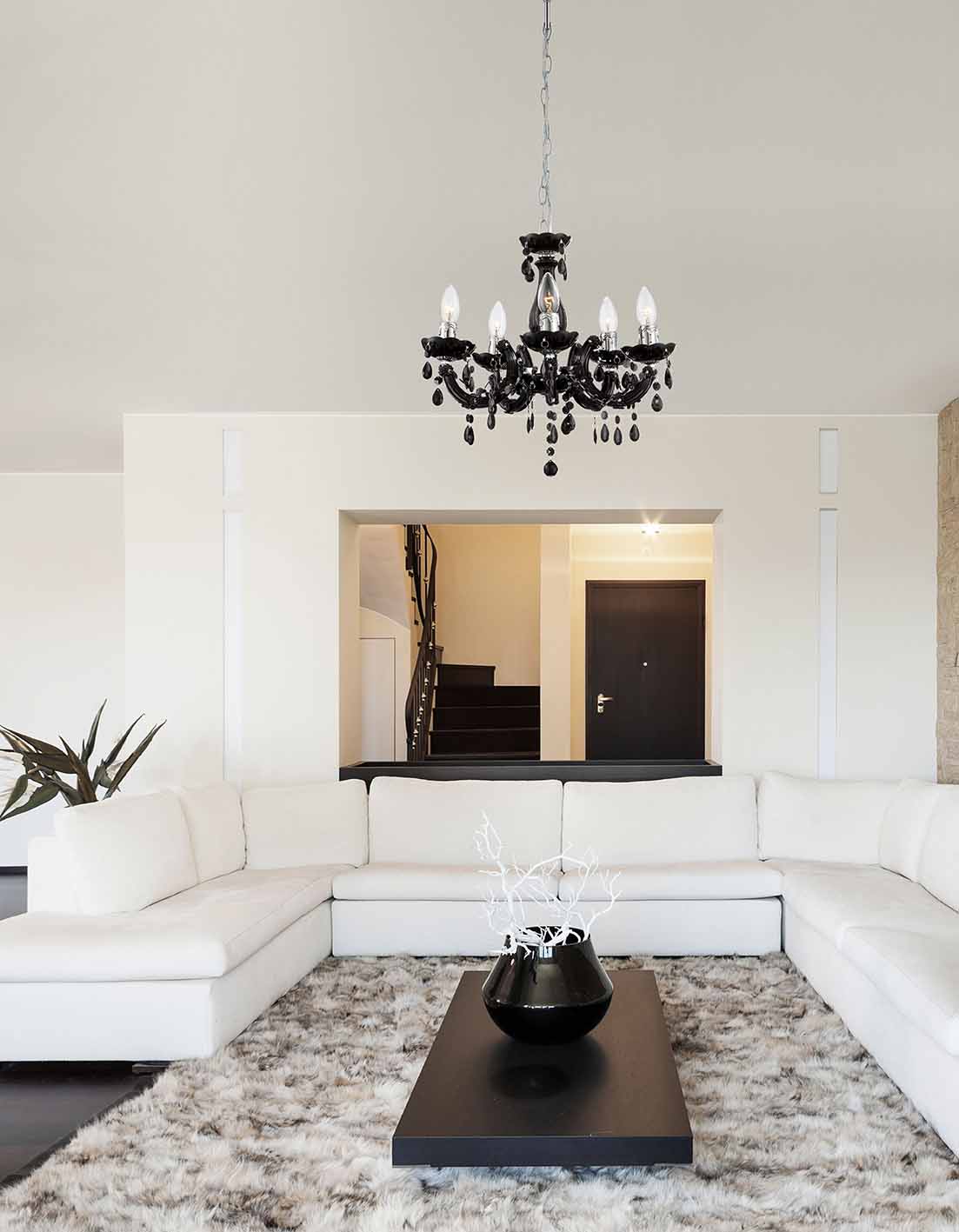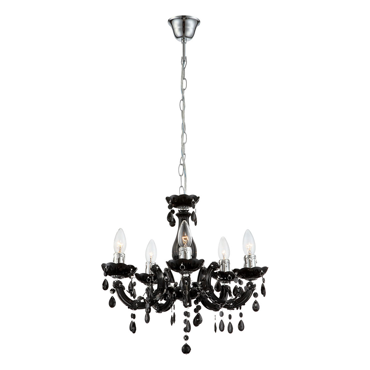 Der Cuimbra II Kronleuchter, in einem glänzenden schwarz verchromten Finish, präsentiert sich mit schicken Acrylkristallen. Dieses stilvolle hängende Licht hat einen Durchmesser von 44 cm und ist mit fünf E14-Fassungen ausgestattet, die es Ihnen ermöglichen, jede Art von Lampe bis zu 40W zu installieren. Aufgrund ihrer langen Lebensdauer und Energieeffizienz empfehlen wir die Verwendung von LED-Lampen. Mit diesem klassischen Stück verleihen Sie jedem Raum einen Hauch von Eleganz.