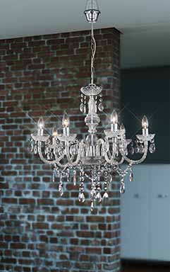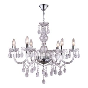 Entdecken Sie den Vintage-Charme unseres Cuimbra I-Serie Kronleuchters, fachmännisch gefertigt mit einem eleganten verchromten Acryl-Finish. Dieses wunderschöne Lichtstück, verziert mit hängenden Kristallen, verleiht jedem Raum eine raffinierte Aura mit seinen großzügigen Abmessungen von 67 cm Durchmesser und 1,66 Meter Höhe. Jeder der sechs gebogenen Arme ist mit einer E14-Buchse ausgestattet, die Lampen bis zu 40 W unterstützt, wobei LED-Lampen aufgrund ihrer Langlebigkeit und Energieeffizienz empfohlen werden. Dieses klassische Design harmoniert wunderbar mit dem Rest der Artikel aus der Cuimbra I-Kollektion.