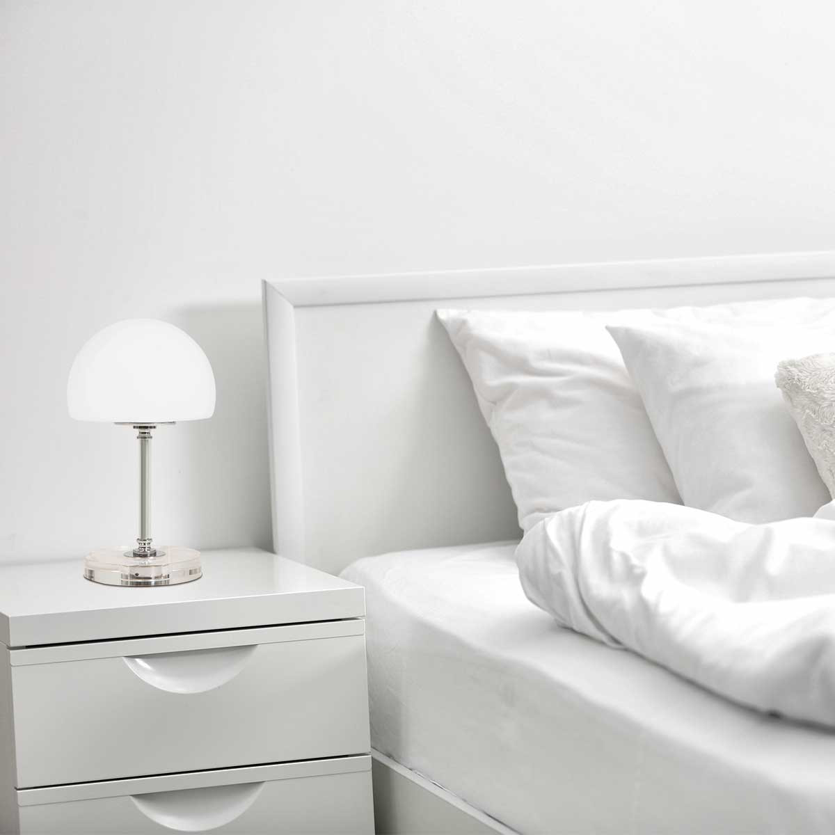 Ancilla ist eine einzigartige Nachttischlampe. Die chromatische Farbe und das weiße Glas machen Ancilla zu einer modernen Lampe. Das weiße Glas hat nicht nur eine luxuriöse Ausstrahlung, sondern ist auch funktional. Auf diese Weise sieht man die Lichtquellen nämlich nicht! Ancilla eignet sich nicht nur neben dem Bett, sondern auch der Beistelltisch lässt sich gerne mit Ancilla füllen. Tipp: Fan dieser Steinhauer Tischlampe? Dann schau dir auch die kleine kugelförmige Variante von Ancilla an! So kannst du diesen Stil an mehreren Orten im Haus wieder aufgreifen.