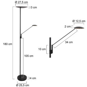 Diese Stehlampe verfügt über eine 3-stufige Farbtemperaturregelung zwischen 2700 und 4000 Kelvin. Der verstellbare Arm enthält ein 7 Watt LED-Modul mit maximal 700 Lumen, während das Uplight mit einem 33 Watt LED-Modul kraftvolle 3300 Lumen liefert. Beide Lichtquellen sind dimmbar und lassen sich einfach über einen Knopf am aufsteigenden Rohr bedienen. Das matt schwarze Metall-Design verleiht dieser Stehlampe ein modernes und robustes Erscheinungsbild.