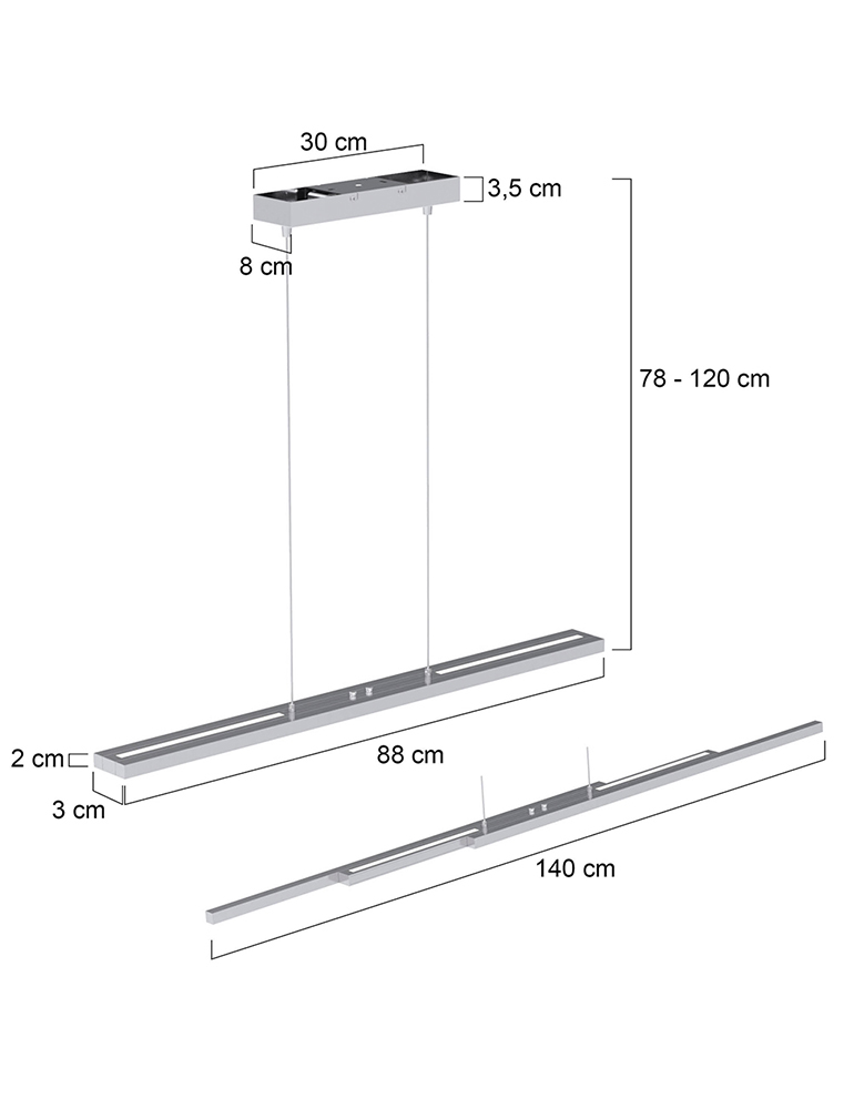 Die moderne, ausziehbare Esszimmerlampe aus der Zelena-Serie von Steinhauer bietet ein einzigartiges Beleuchtungserlebnis dank vier Lichtpunkten: zwei an der Unterseite und zwei an der Oberseite, wodurch das Licht auf besondere Weise verteilt wird. Ausgestattet mit integrierten LED-Strips (2x 4 Watt, 800 Lumen und 2x 13 Watt, 2600 Lumen) für eine optimale Lichtverteilung. Der Push-Dimmer an der Oberseite ermöglicht es, die Lichtfarbe zwischen 2200 und 4000 Kelvin anzupassen und die Intensität zu dimmen. Höhenverstellbar von 78 cm bis 120 cm und in der Länge von 88 cm bis 140 cm verstellbar.