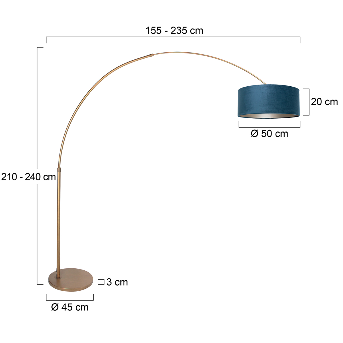 Bringen Sie Ruhe und Eleganz in Ihr Zuhause mit dieser klassischen Bogenlampe in bronzefarben mit einem tiefblauen Samtschirm. Der weiche Stoff vermittelt ein reichhaltiges Gefühl und das tonnenförmige Design sorgt für eine angenehme Lichtverteilung. Durch die neigbare Fassung bleibt der Schirm immer schön gerade hängen, was für ein sauberes und stilvolles Gesamtbild sorgt.