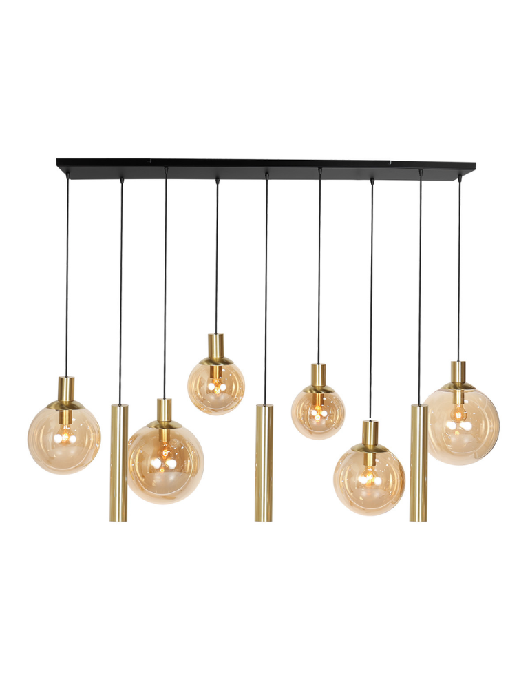 Elegante 9-flammige Hängeleuchte aus der Bollique-Serie von Steinhauer, ausgestattet mit 6 bernsteinfarbenen Glasbällen in verschiedenen Größen und 3 Röhren, die direktes Licht werfen. Die Bälle haben eine subtil spiegelnde Oberfläche für einen zusätzlichen luxuriösen Effekt. Mit einer Breite von 150 cm und einer Tiefe von 55 cm ist diese Lampe ideal über einem Esstisch oder in einem offenen Wohnraum. Die Röhren sind mit dimmbaren Lichtquellen von 4,9 W ausgestattet, einstellbar von 2200 bis 2700 Kelvin. Inklusive 2 Jahre Herstellergarantie.