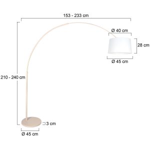 Die Lampe ist bis zu 240 cm ausziehbar und steht auf einer robusten Fußplatte von 45 cm. Mit dem langen Kabel von 250 cm und dem Fußschalter ist die Lampe einfach zu bedienen. Der Leinen-Schirm läuft leicht konisch zu und hat eine Höhe von 28 cm, was für eine angenehme Lichtverteilung im Zuhause sorgt.