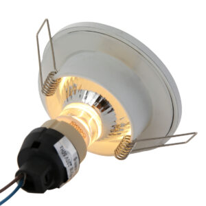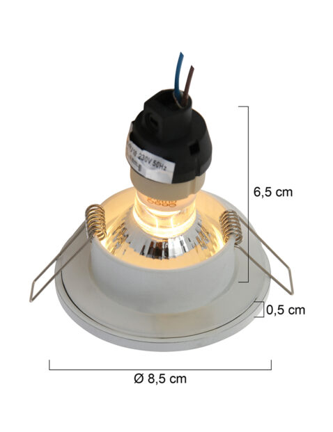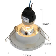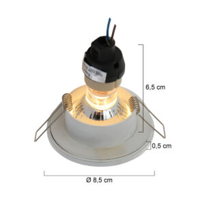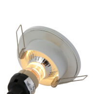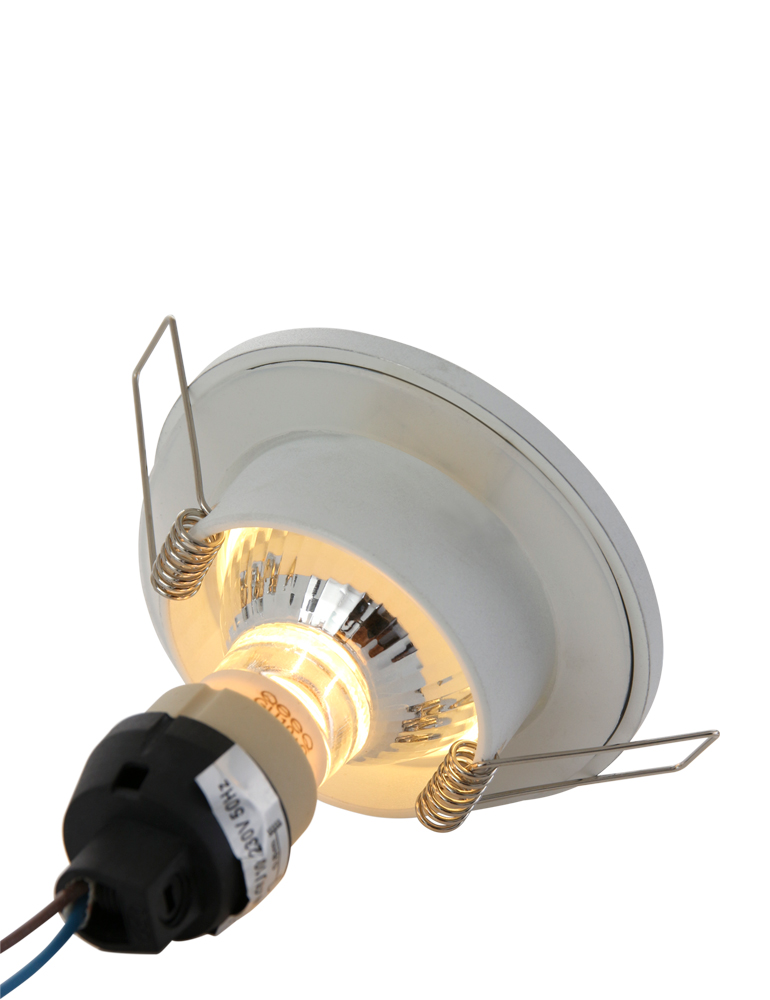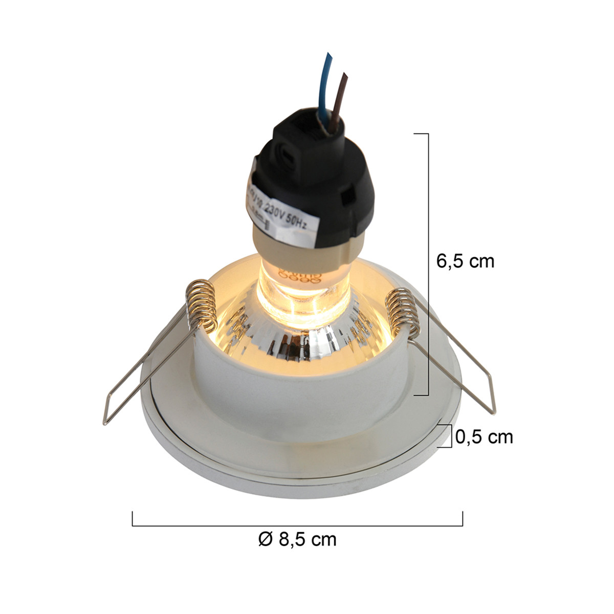 Der weiße Spot aus der Pélite-Spotserie besteht aus weißem Stahl und Glas und ist nicht schwenkbar. Die Lampe hat eine GU10-Fassung und ist für Lichtquellen bis zu 40 Watt (nicht enthalten) geeignet. Mit dem Klemmsystem lässt sich dieses Spotlight einfach einbauen. Die Höhe des Einbau-Spotlights beträgt 3,5 cm, davon ragt 0,5 cm heraus. Der Einbaudurchmesser beträgt 65 mm. Dank der IP44-Klassifizierung ist dieses Spotlight für Badezimmerzone 2 geeignet. Die Lampe ist dimmbar mit einem externen Dimmer und einer geeigneten Lichtquelle (nicht enthalten).