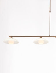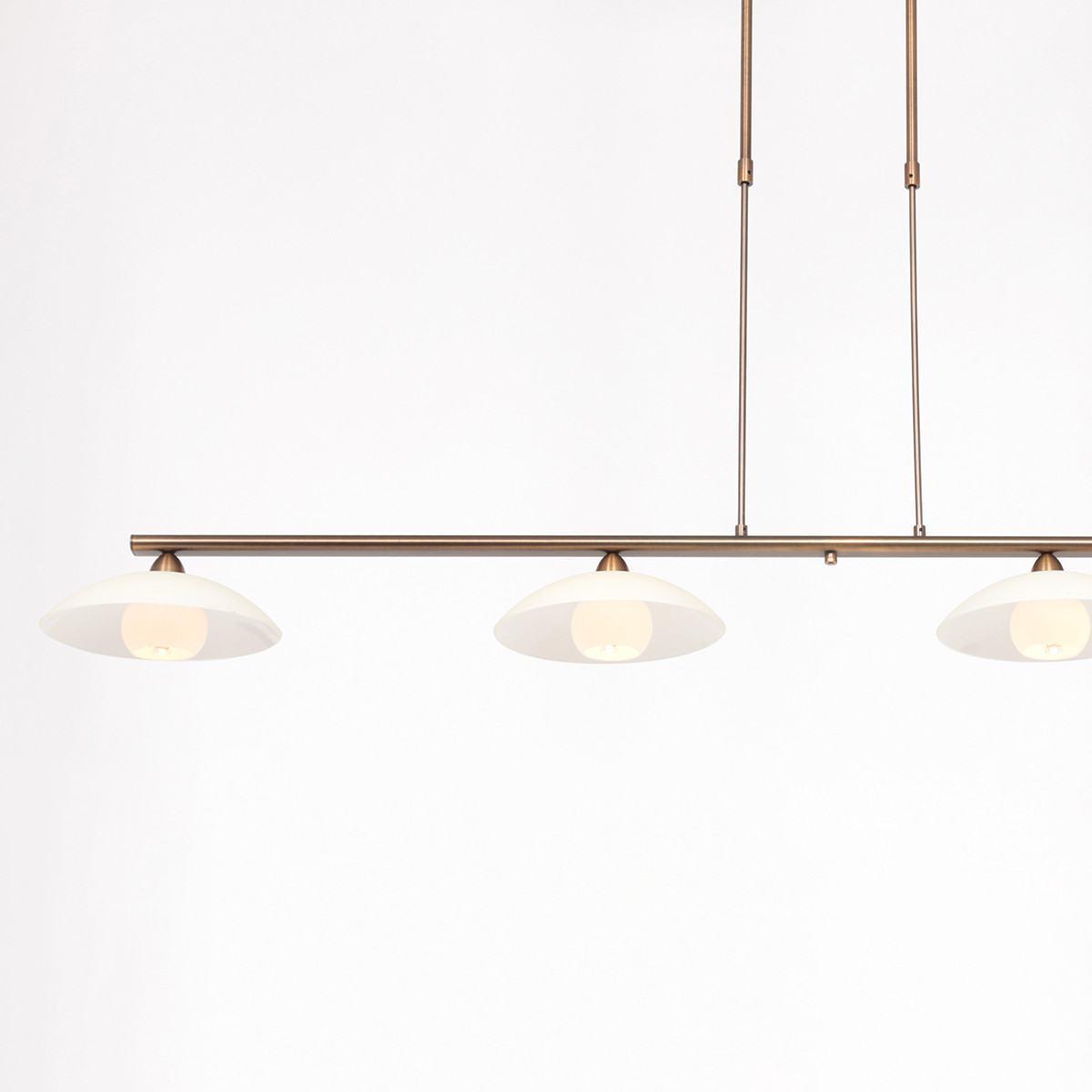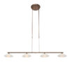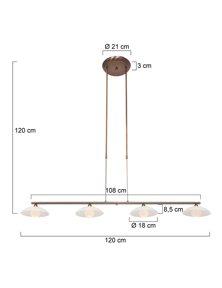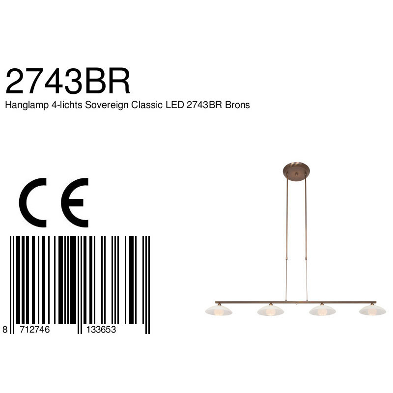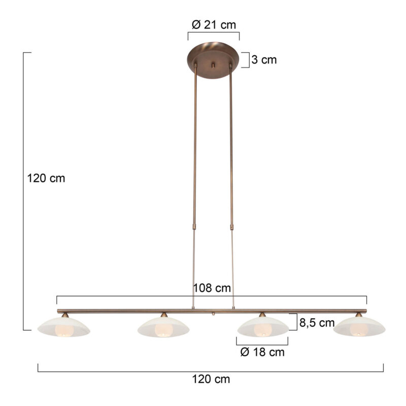 Die Sovereign Classic Pendelleuchte ist eine stilvolle Ergänzung für dein Interieur. Das bronzefarbene Metallrohr unterstützt vier cremefarbene Glasschalen, die jeweils mit einer 3 Watt LED-Lichtquelle ausgestattet sind. Mit einer warmen Farbtemperatur von 2700 Kelvin und einer Lichtausbeute von 300 Lumen pro Lampe bietet diese Pendelleuchte stimmungsvolle Beleuchtung. Die Höhe ist von 80 bis 120 cm verstellbar, sodass du sie perfekt auf deinen Esstisch oder Raum abstimmen kannst. Der integrierte Push-Dimmer ermöglicht es, die Helligkeit einfach anzupassen.