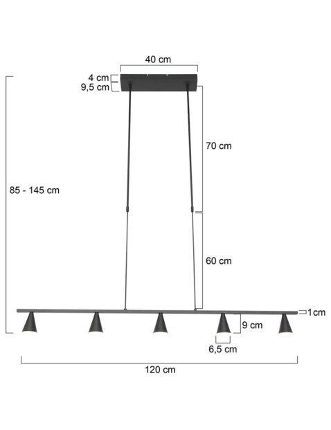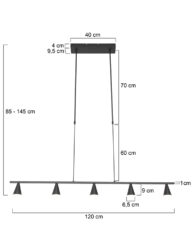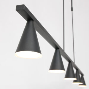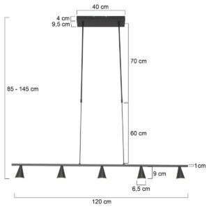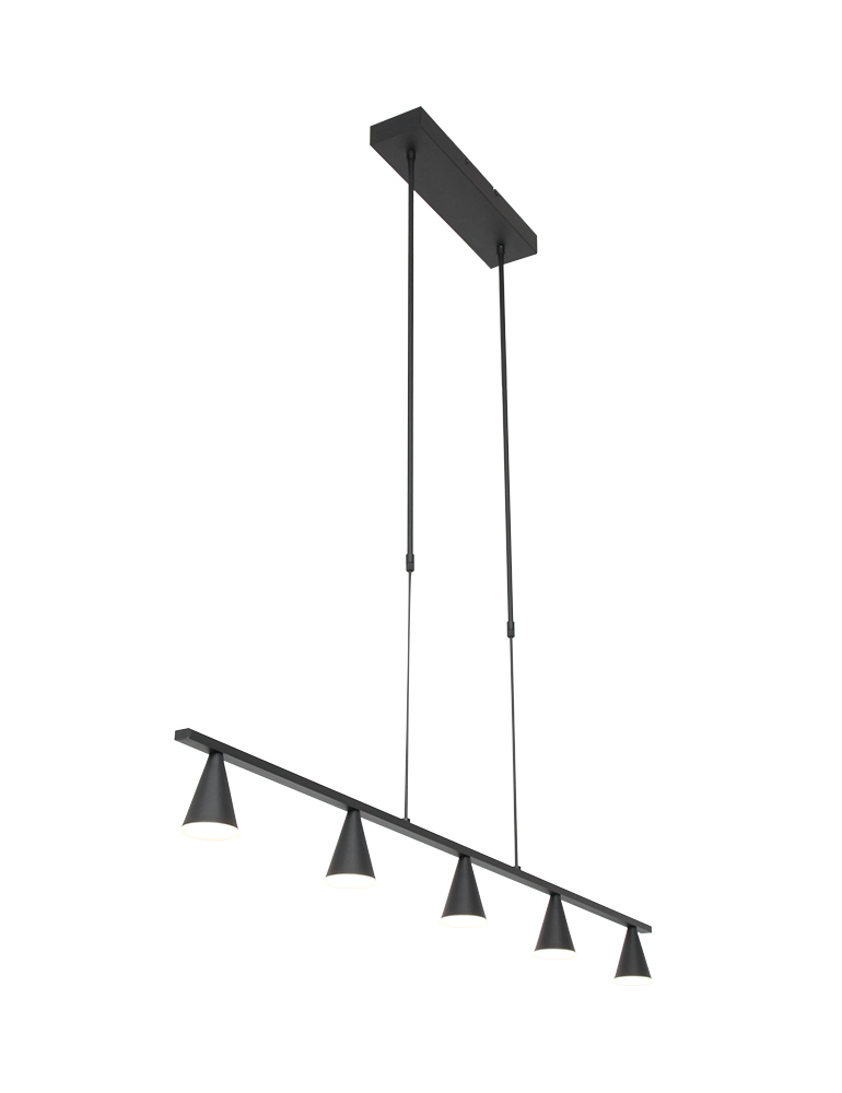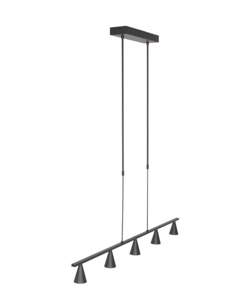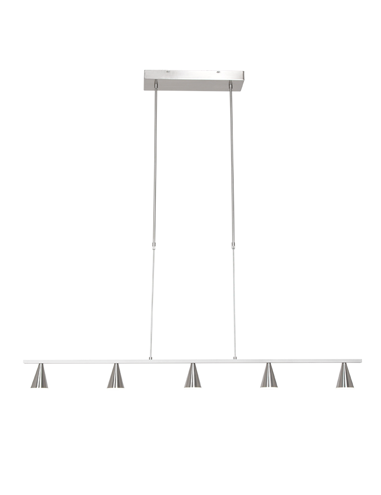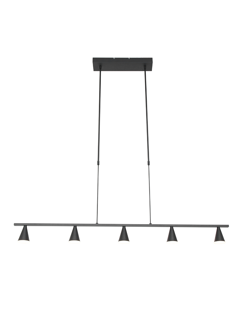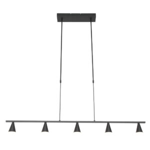 Die Vortex Hängeleuchte kombiniert Stil mit Funktionalität. Dieses moderne Design mit fünf kegelförmigen Lichtpunkten verfügt über feste LED-Module mit 5 Watt, mit einer Gesamtlichtausbeute von 1100 Lumen. Die Lampe bietet einstellbare Lichtfarben zwischen 2700 und 4000 Kelvin, sodass du ganz einfach die richtige Atmosphäre schaffen kannst. Der Touch-Dimmer an der Lampe ermöglicht es, die Lichtintensität mühelos anzupassen. Die Höhe ist von 85 bis 145 cm verstellbar, und mit einer Länge von 120 cm passt diese Lampe perfekt über den Esstisch.