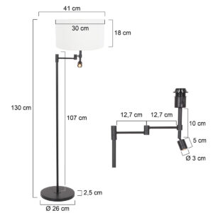 Beide Lichtquellen sind separat steuerbar: die Hauptbeleuchtung über einen Schalter an der Fassung und das Leselicht über einen Schalter am Standrohr. Dank des ausklappbaren Arms kann das Licht genau an die gewünschte Stelle gerichtet werden. Mit einer Höhe von 120 cm, einem Fußdurchmesser von 26 cm und einer Kabellänge von 180 cm ist diese Stehlampe eine praktische und stilvolle Ergänzung für jedes Interieur.
