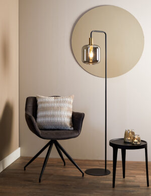 Der Glasschirm hat einen Raucheffekt und macht den Raum wärmer, wenn das Licht angeschaltet ist. Das bescheidene Design macht sie sowohl für moderne als auch für Design-Interieurs beliebt. Das Lampenmodell besteht aus Glas- und Stahlmaterialien und besticht mit einem schwarzen und goldenen Finish. Die Stehlampe benötigt eine Glühbirne mit einer E27-Fassung (max. 40 Watt). Diese müssen separat bestellt werden. Möchten Sie Ihr Interieur gemütlicher gestalten? Dann installieren Sie einen Dimmer, der nicht im Lieferumfang enthalten ist.