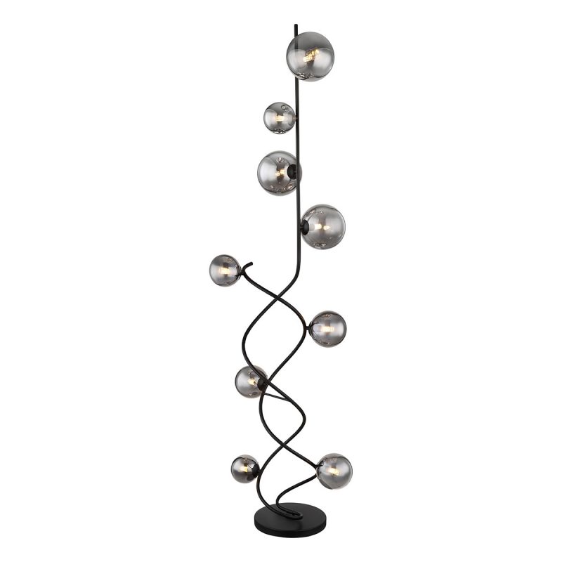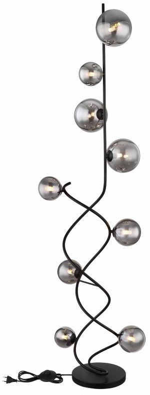 Entdecken Sie die raffinierte RIHA Stehlampe, eine Bereicherung für jedes Interieur. Die Verschmelzung von mattschwarzem Metall und getöntem Glas schafft eine warme, einladende Atmosphäre. Sie können die Lampe dank des hochwertigen Kabels von 1,8 m flexibel positionieren, und für einfaches Schalten sorgt ein praktischer Fußschalter. Die RIHA, mit einem Durchmesser von 25 cm und einer Höhe von 1,59 m, ist ideal für Wohnräume, Schlafzimmer oder Büros und wirft ein sanftes Licht durch drei Glaskugeln in unterschiedlichen Größen. Ausgestattet mit neun G9 LED-Lampen strahlt sie warmweißes Licht aus, das perfekte Gleichgewicht zwischen praktischer Funktionalität und ansprechendem Design.