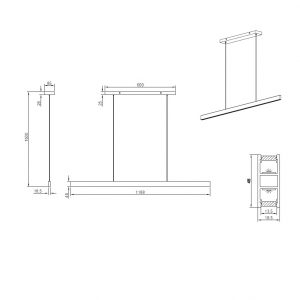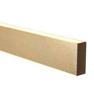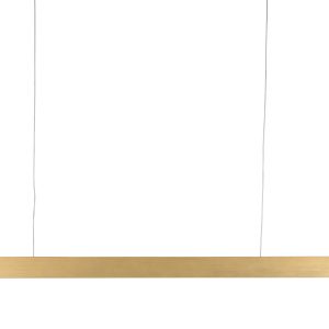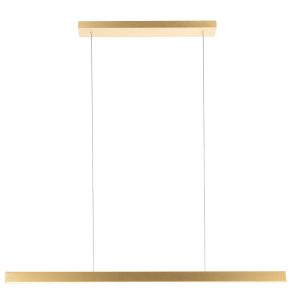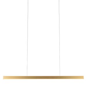 Die BrightLine Hängeleuchte der Marke Mexlite kombiniert ein straffes, minimalistisches Design mit einer warmen Ausstrahlung. Diese goldfarbene Designerlampe hat eine Breite von 119 cm, ist nur 2 cm dick und 5 cm hoch und hängt an zwei Stahlkabeln, die von 30 bis 150 cm verstellbar sind – ideal über einer Kochinsel, einem Esstisch oder einer Bar in einem modernen Interieur.