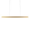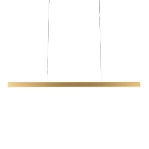 Die BrightLine Hängeleuchte der Marke Mexlite kombiniert ein straffes, minimalistisches Design mit einer warmen Ausstrahlung. Diese goldfarbene Designerlampe hat eine Breite von 119 cm, ist nur 2 cm dick und 5 cm hoch und hängt an zwei Stahlkabeln, die von 30 bis 150 cm verstellbar sind – ideal über einer Kochinsel, einem Esstisch oder einer Bar in einem modernen Interieur.
