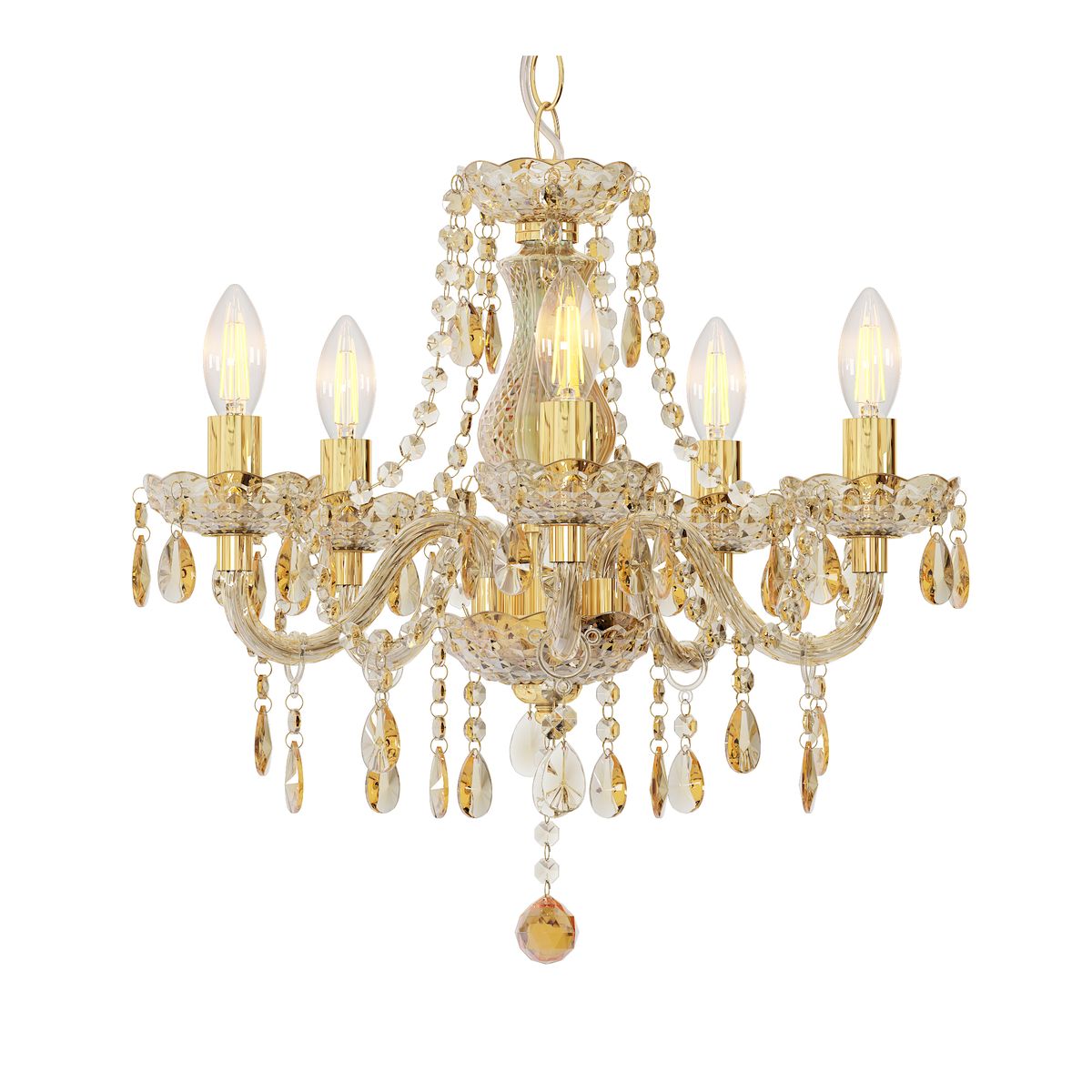 Für den MARIE Kronleuchter werden fünf E14-Lampen benötigt, mit einer maximalen Leistung von 40W, diese sind nicht im Lieferumfang enthalten. Genießen Sie die stilvolle Beleuchtung und den luxuriösen Look, den dieser Kronleuchter Ihrem Zuhause verleiht. Er ist die ideale Wahl für schicke Esszimmer, stilvolle Wohnzimmer oder elegante Flure und verwandelt jeden Raum in eine stimmungsvolle Oase. Bringen Sie Glamour in Ihr Interieur mit diesem wunderschönen Kronleuchter, der zweifellos ein Statement in Ihrem Haus setzt.