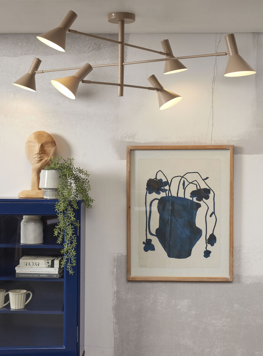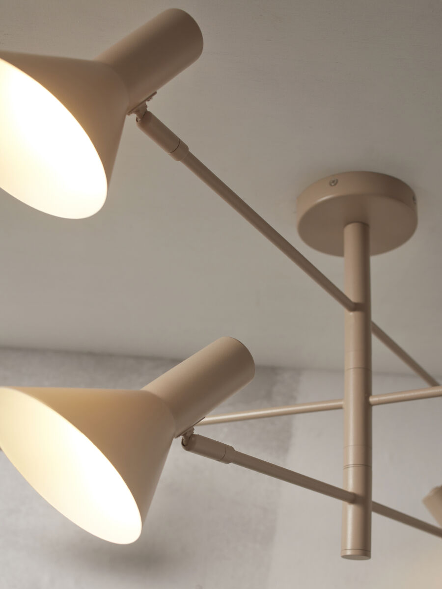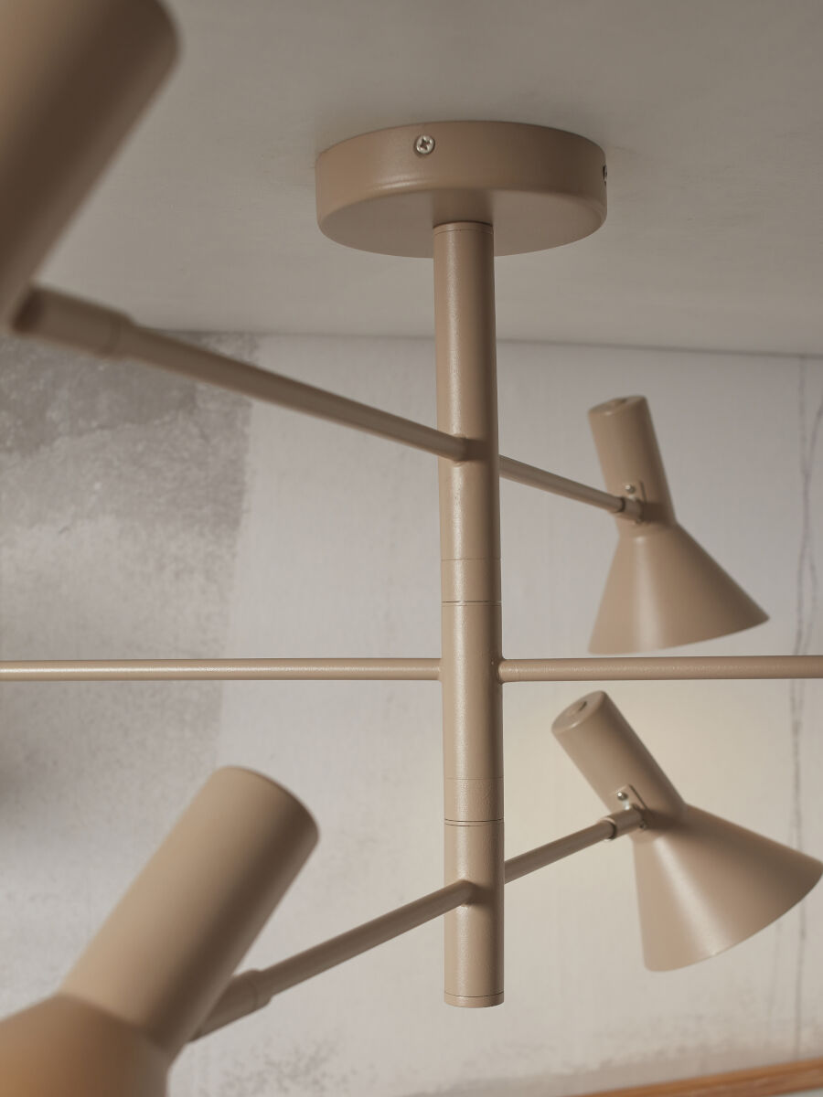 Graue Retro-Deckenleuchte aus Metall, perfekt für das Esszimmer. Ausgestattet mit sechs kleinen E14-Fassungen und staubdicht (IP20). Diese Lampe verbindet einen klassischen Look mit moderner Eleganz. Das graue Metalldesign sorgt für eine stilvolle und raffinierte Atmosphäre. Ideal, um eine elegante und einladende Essumgebung mit einem Retro-Flair zu schaffen.