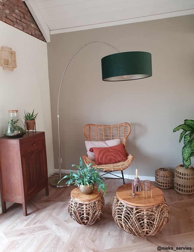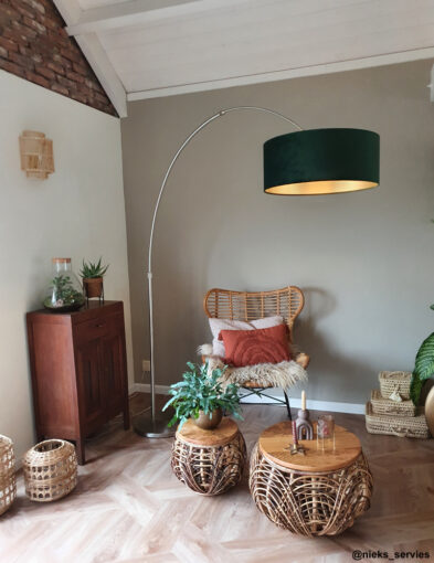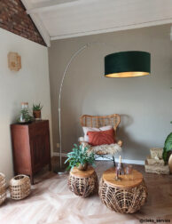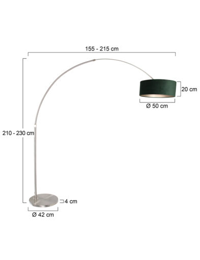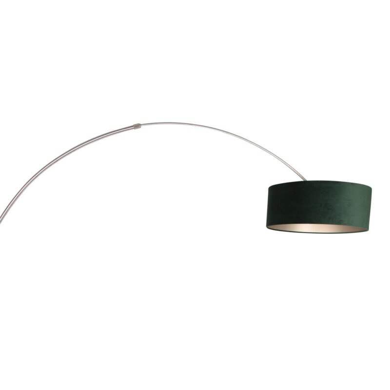 Diese stilvolle Bogenlampe kombiniert raffinierte Eleganz mit praktischer Bequemlichkeit. Der grüne Velours-Schirm strahlt Wärme und Eleganz aus, während der subtil gebogene Rahmen für eine luftige Ausstrahlung sorgt. Dank des verstellbaren Bogens passt du das Licht ganz einfach an deinen Raum an, wodurch die Lampe sowohl eine funktionale als auch eine stimmungsvolle Ergänzung wird.