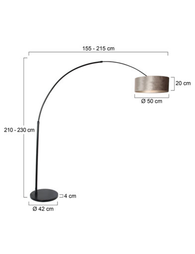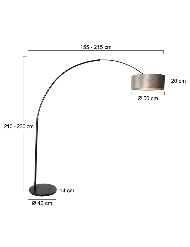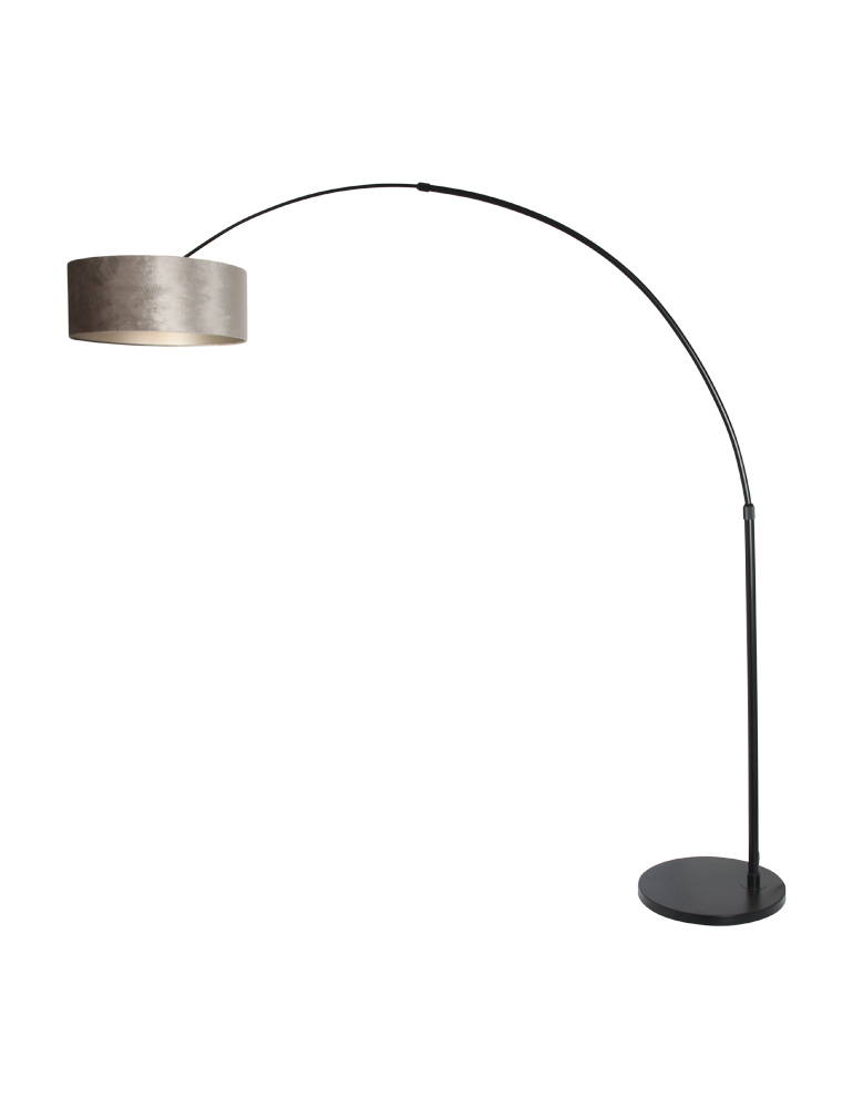 Diese Bogenlampe strahlt zurückhaltenden Luxus aus. Die Kombination aus einem mattschwarzen Rahmen und einem silberfarbenen Velourslampenschirm verleiht deinem Interieur eine subtile, aber stilvolle Note. Der verstellbare Bogen bietet Flexibilität in der Beleuchtung, sodass du je nach Situation sowohl eine intime als auch eine funktionale Lichtstimmung schaffen kannst.
