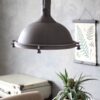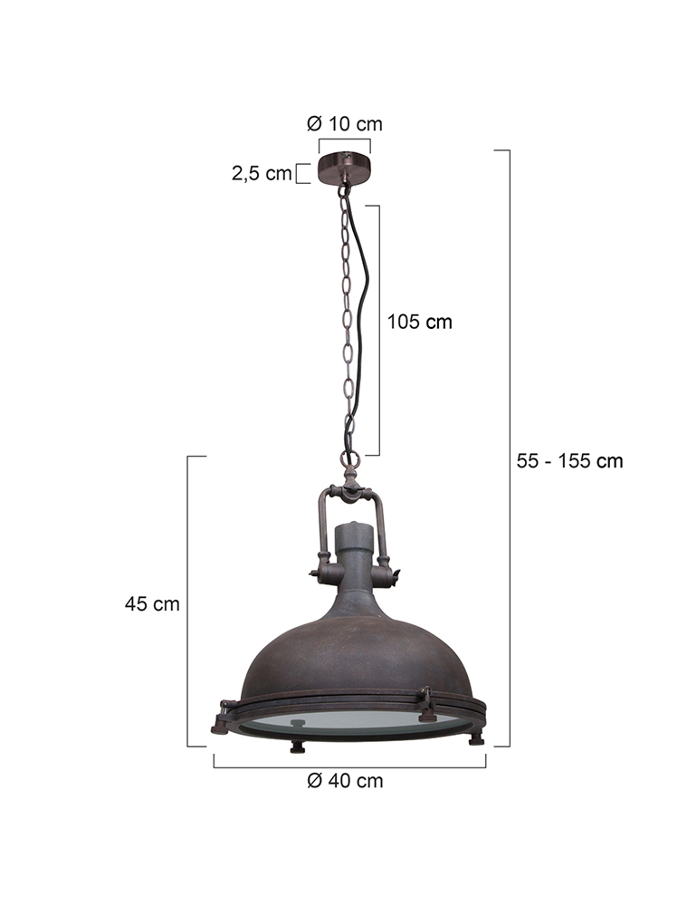 Industrielle Landhaus-Hängeleuchte aus der Eliga-Serie, ausgeführt in verwittertem Braun mit einer robusten Kette von 105 cm. Der massive Metallschirm hat einen Durchmesser von 40 cm und eine Höhe von 45 cm, was für eine auffällige Ausstrahlung sorgt. In der Höhe bis maximal 155 cm verstellbar und ausgestattet mit einer E27-Fassung, geeignet für Lichtquellen bis 40 Watt. Ideal über dem Esstisch oder als Stimmungslicht in einem industriellen Interieur.