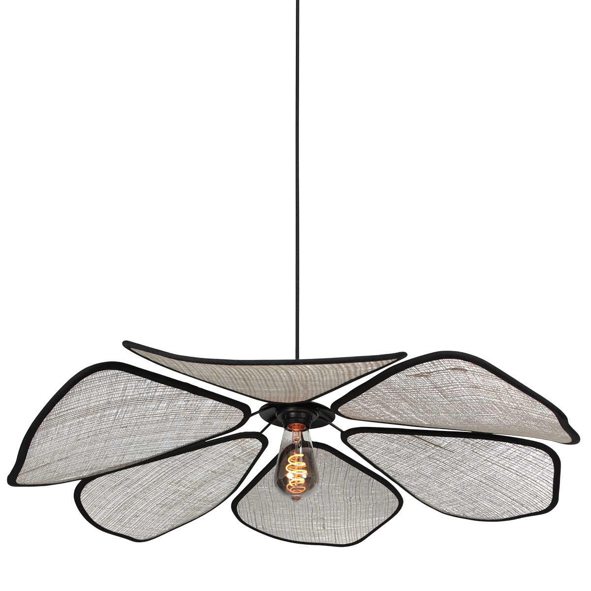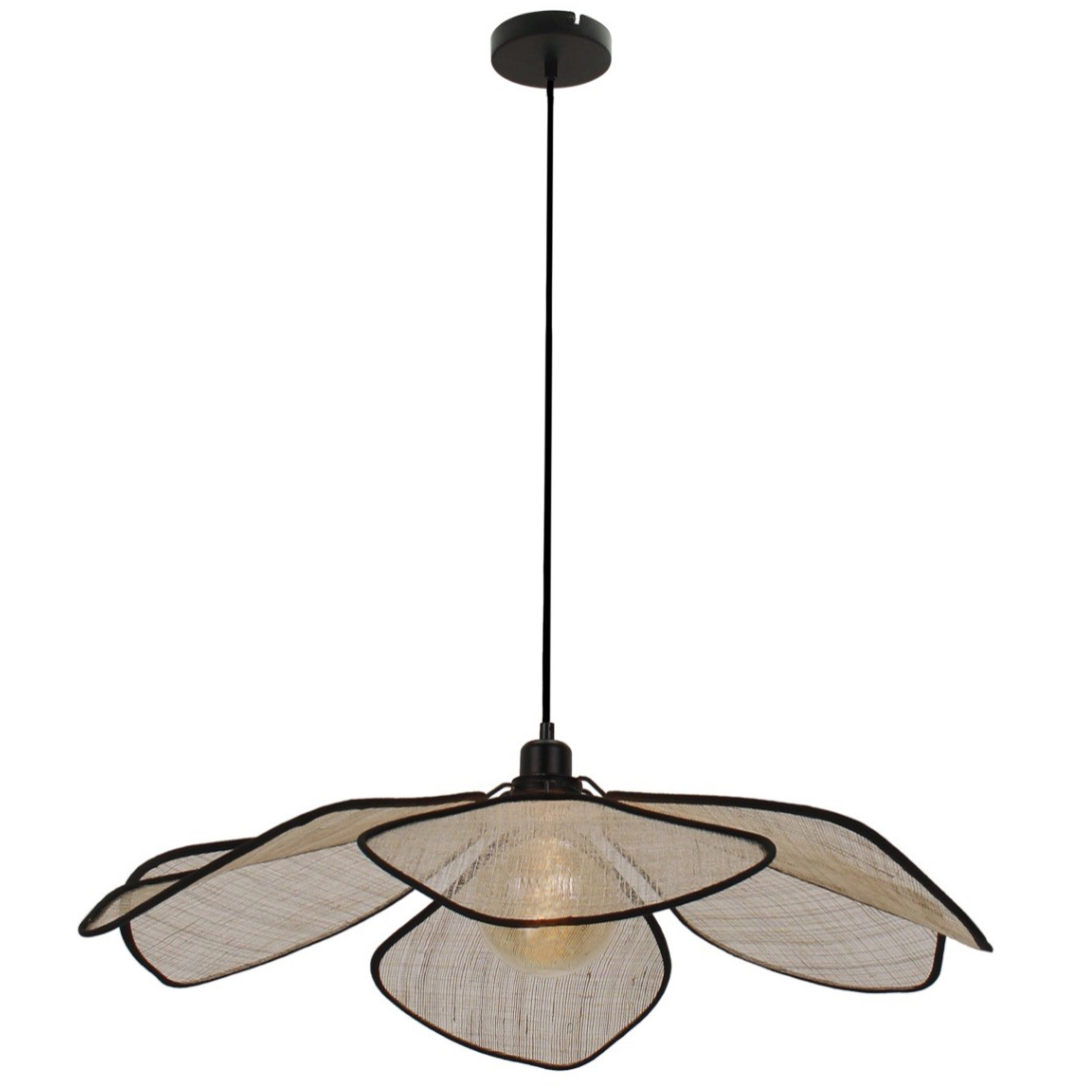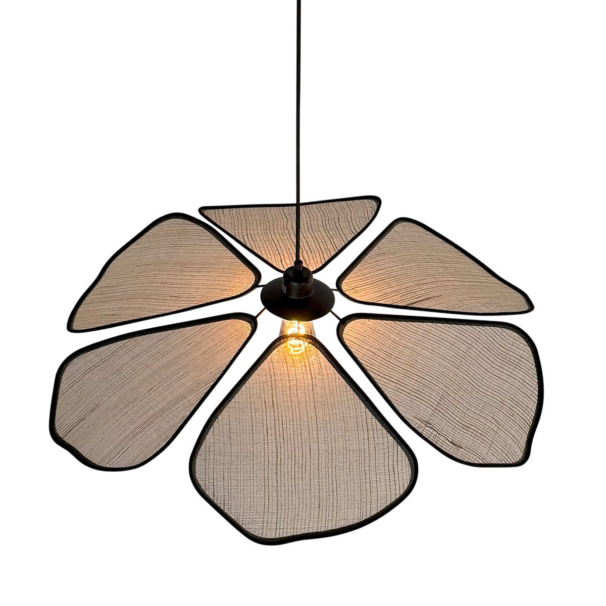 Die LumaFlora Pendelleuchte hat eine einzigartige Blumenform mit sechs Leinenblättern, die sanft diffuses Licht rund um eine zentrale E27-Fassung verbreiten. Das grau-braune Leinen und das schwarze Metallgestell bilden zusammen eine elegante Mischung aus botanischem, Japandi und modernem Design. Der großzügige Durchmesser macht diese Lampe zu einem echten Blickfang über dem Esstisch oder in einem geräumigen Wohnzimmer.