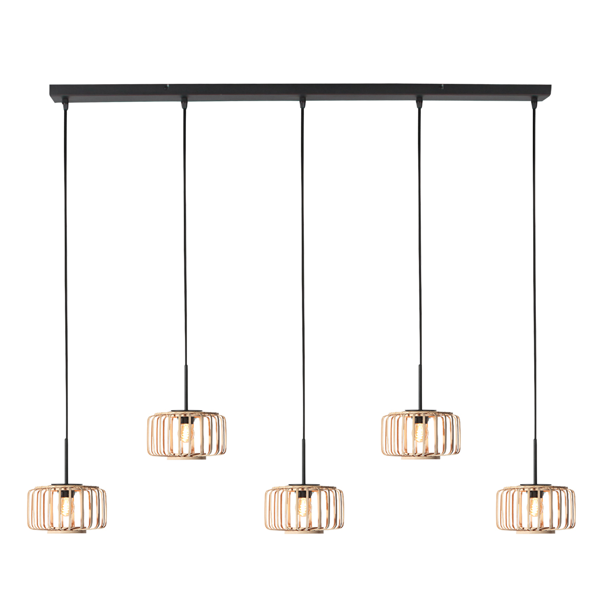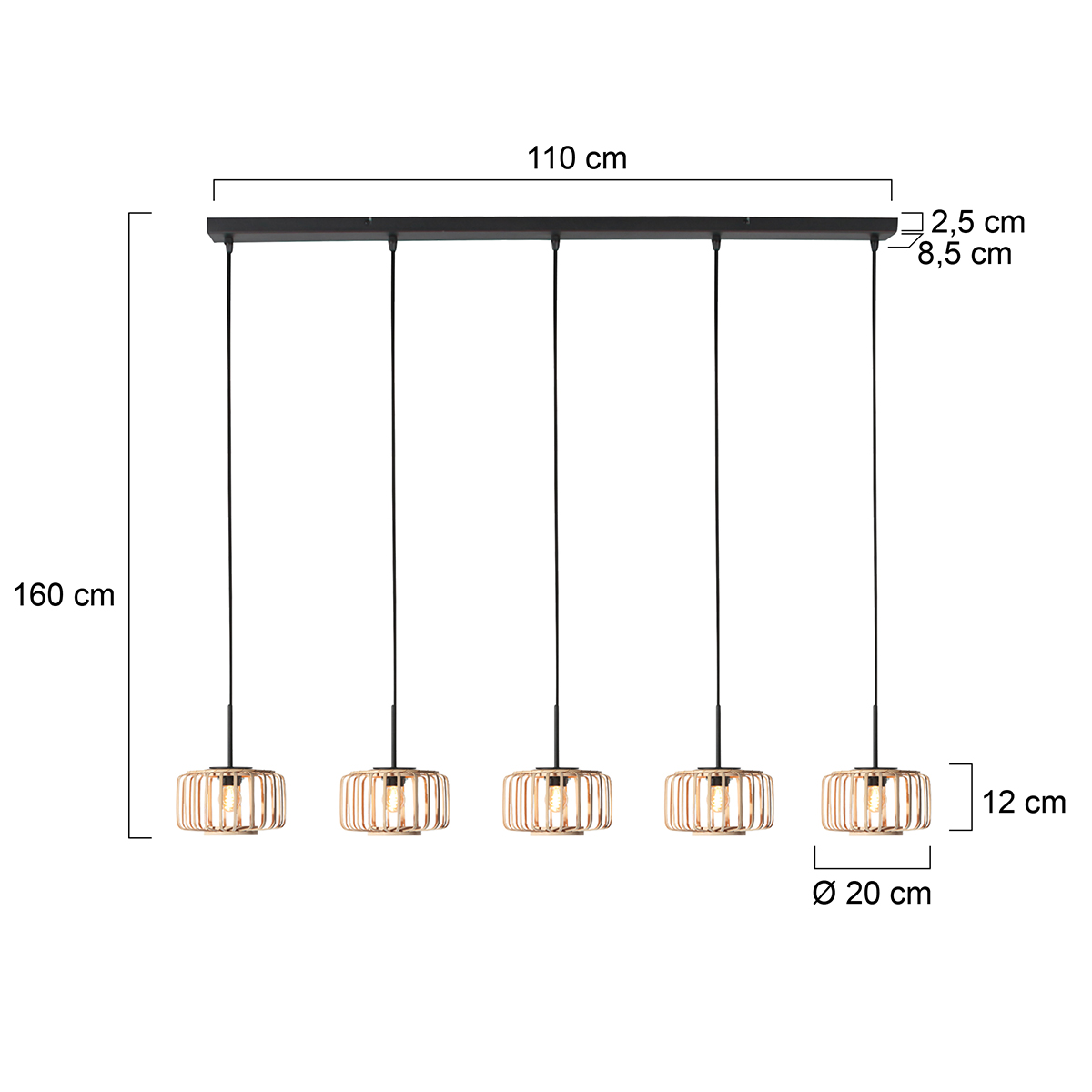 Diese mehrflammige HaloSwap-Hängelampe kombiniert einen schwarzen Balkenpendel mit fünf natürlichen Bambuskappen von jeweils 20 cm. Die gerade Linienanordnung sorgt für eine stilvolle und gleichmäßige Lichtverteilung, perfekt über einem Esstisch, Kochinsel oder Bar. Die natürliche Bambusfarbe verleiht der Lampe eine warme, ruhige Ausstrahlung, die schön in moderne und skandinavische Interieurs passt.