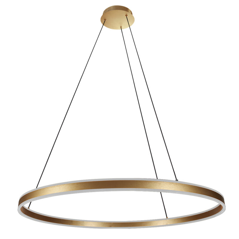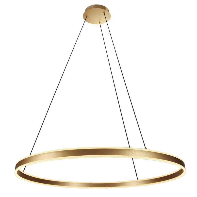 Die goldene Ringlux Hängeleuchte hat einen großzügigen Durchmesser von 100 cm und strahlt zeitlose Eleganz aus. Mit einer Lichtausbeute von 7200 Lumen und einer Farbtemperatur von 2700K bietet diese Lampe eine angenehme und gleichmäßige Beleuchtung. Dimmbarkeit über einen externen Dimmer (2 x 40W) und in der Höhe verstellbar von 50 bis 190 cm. Ein stilvoller Blickfang mit 2 Jahren Herstellergarantie.