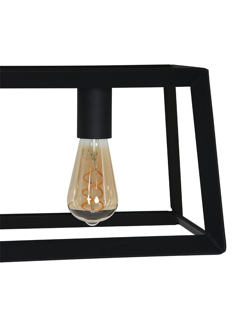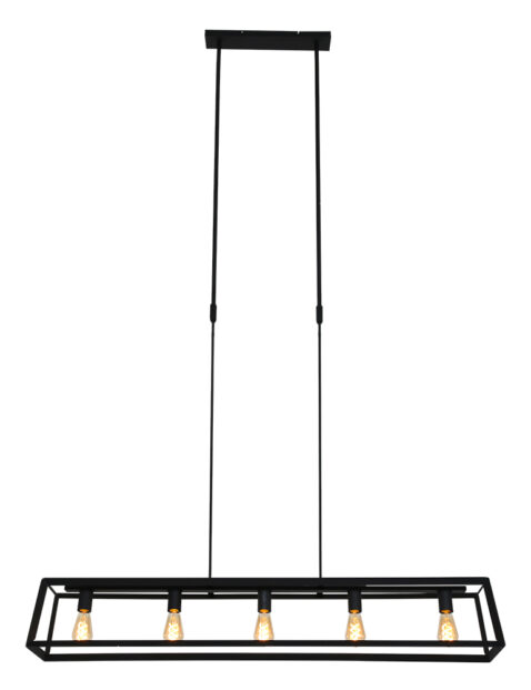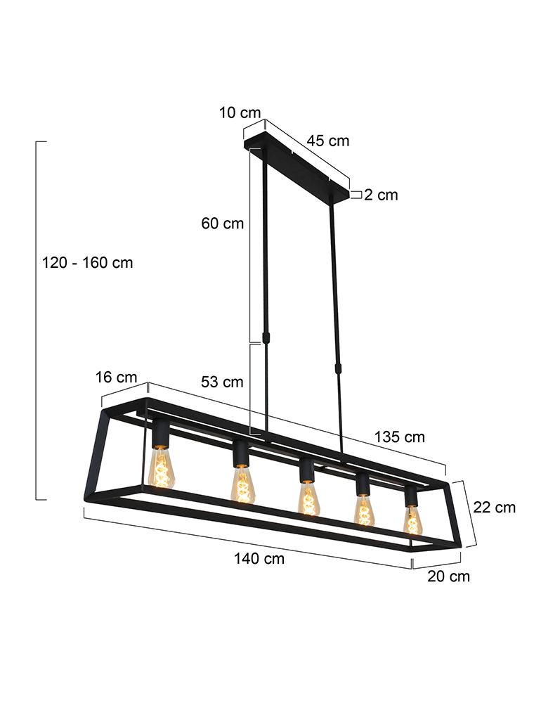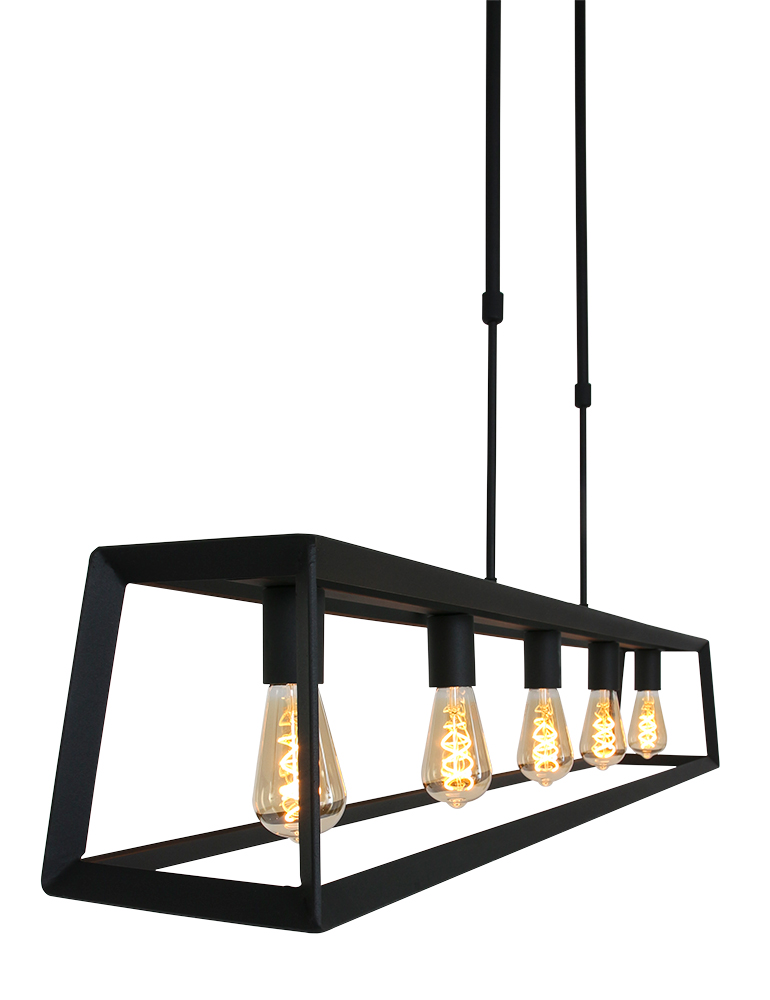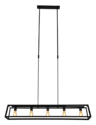 Die Hängeleuchte aus der Buckley-Serie hat einen robusten offenen Rahmen aus mattschwarzem Metall und bietet Platz für fünf E27-Leuchtmittel (nicht enthalten). Dank der offenen Konstruktion wird das Licht frei im Raum verteilt. Die Lampe ist bis zu maximal 145 cm höhenverstellbar und hat eine Breite und Tiefe von 20 cm, mit einer Gesamtlänge von 140 cm. Geeignet für dimmbare Leuchtmittel und einen externen Dimmer.