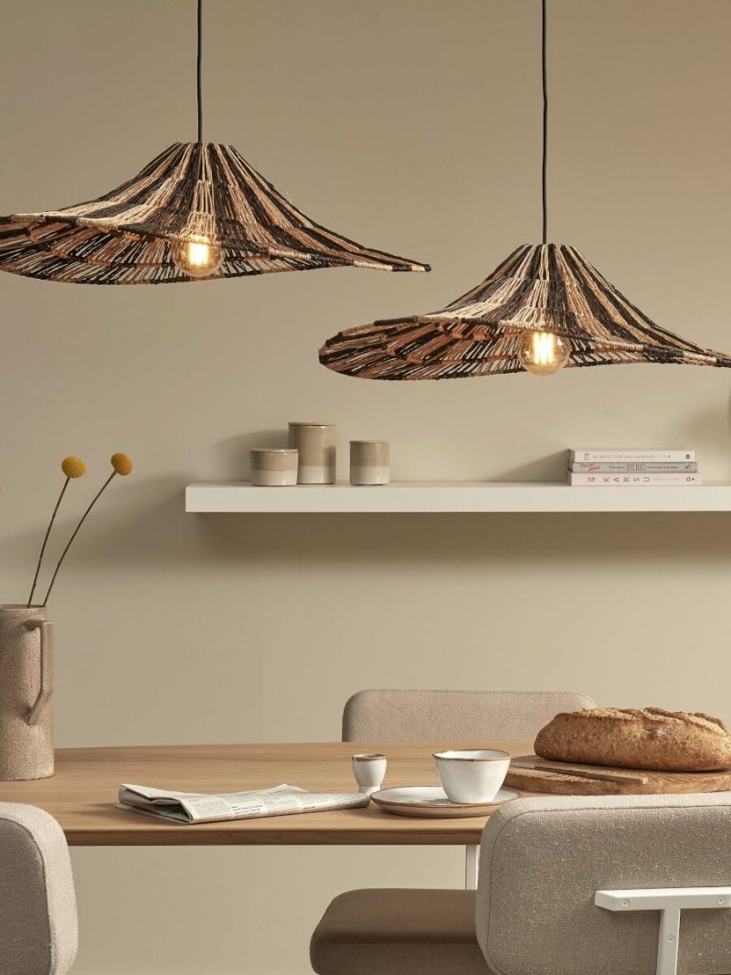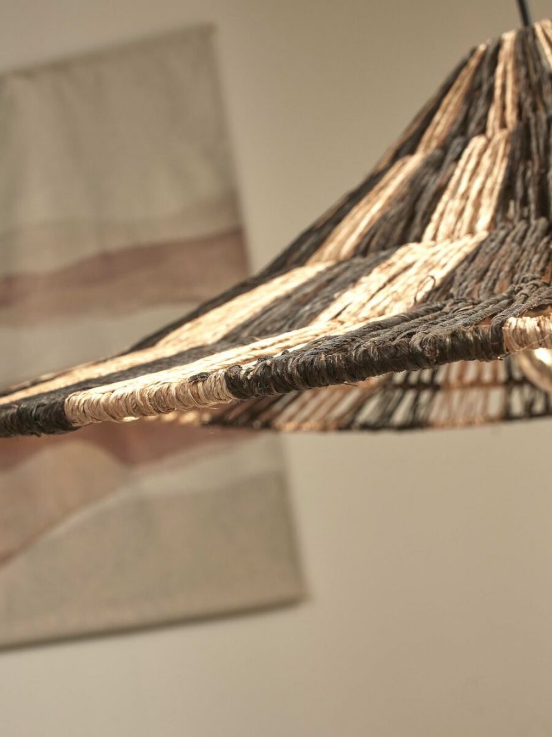 Die hutförmige Pendelleuchte kombiniert natürliche und schwarze Rietdetails für einen stilvollen Boho-Look. Inklusive Lichtquelle, ideal für Esszimmer, Flur, Schlafzimmer oder Wohnzimmer. Ein echter Stimmungsgeber, der Wärme und Charakter hinzufügt.