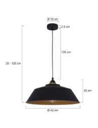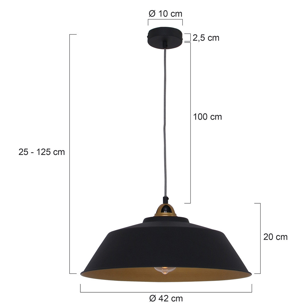 Diese schwarz-goldene Pendelleuchte aus der Nove-Serie bietet eine wunderschöne Kombination aus robust und elegant. Der Schirm hat einen Durchmesser von 42 cm und die Höhe ist zwischen 25 und 125 cm verstellbar, sodass er perfekt in jeden Raum passt. Ausgestattet mit einer E27-Fassung ist die Lampe für Lichtquellen bis zu 40W geeignet. Die Außenseite hat eine matte schwarze Oberfläche, während die goldene Innenseite für eine warme, einladende Ausstrahlung sorgt. Ein echter Blickfang in jedem Interieur!