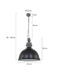 Die XXL Pendelleuchte Bikkel von Steinhauer in Schwarz hat ein kraftvolles und robustes Design. Der Metallschirm hat einen Durchmesser von 52 cm und eine Gesamthöhe von 55 cm. Die Höhe ist bis zu 153 cm verstellbar, um Flexibilität bei der Montage zu gewährleisten. Der Diffusor unter dem Schirm verhindert Blendung und verstärkt den industriellen Look. Geeignet für das Esszimmer, die Diele, das Schlafzimmer oder das Wohnzimmer.