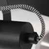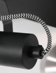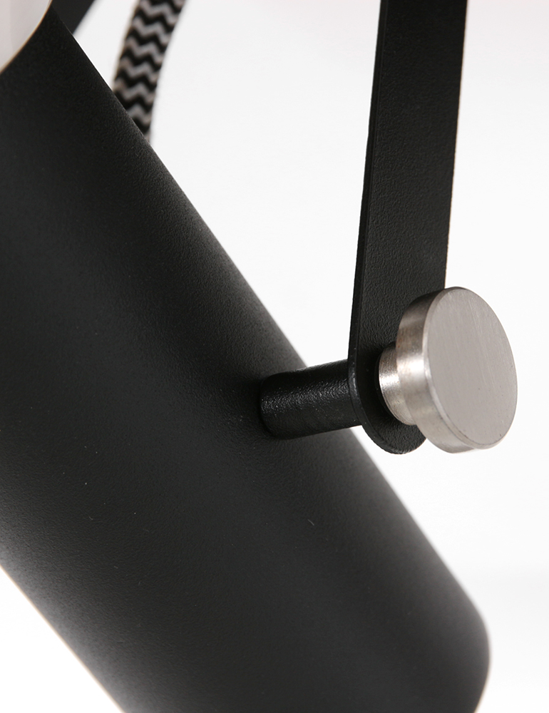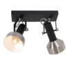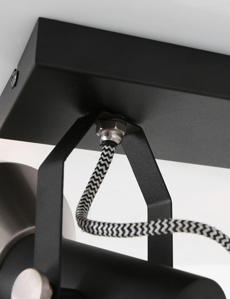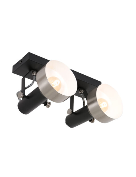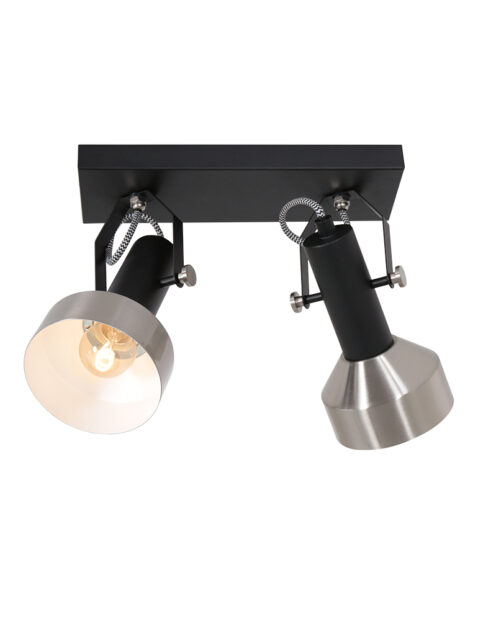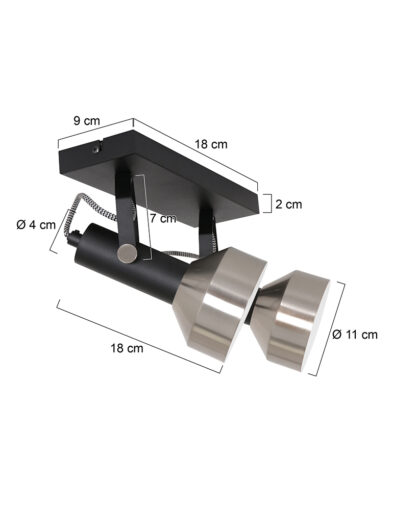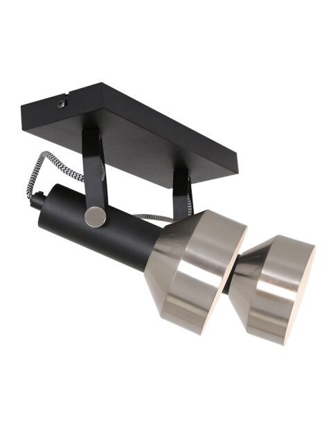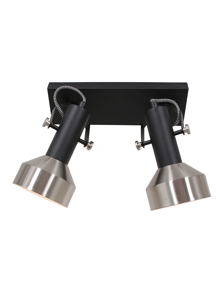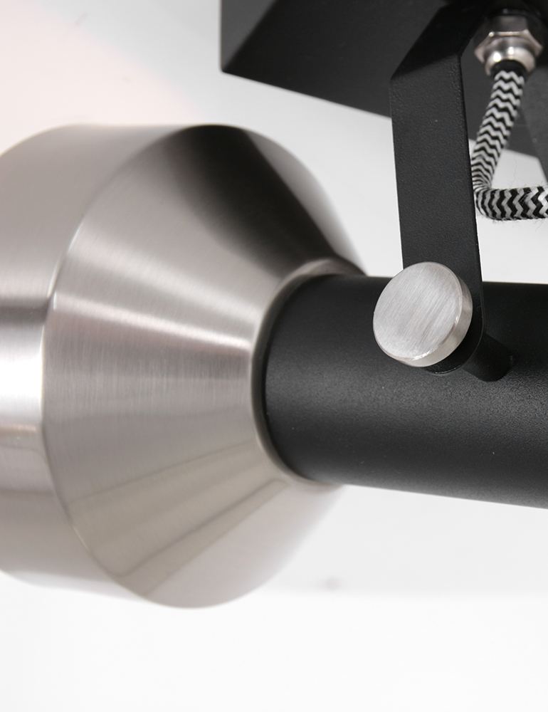 Die modernen Deckenstrahler mit zwei Lichtpunkten verleihen deiner Küche oder deinem Wohnzimmer die richtige Beleuchtung. Die Strahler sind schwarz und haben einen Silberkopf aus gebürstetem Stahl. Beide Strahler sind auf einem schwarzen Plateau montiert. Die Strahler sind geeignet, um über einem Tisch zu hängen, aber du kannst auch wählen, sie auf die Anrichte zu richten.
