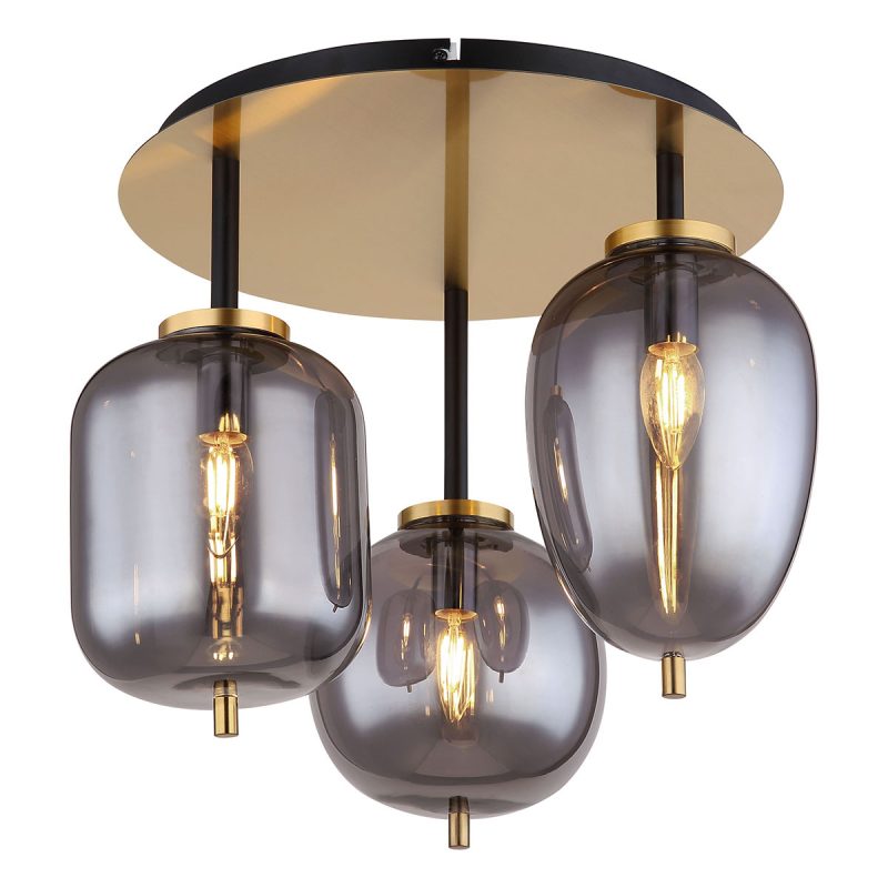 Verschönern Sie Ihre Decke mit dieser eleganten Blacky-Serie Leuchte, ausgestattet mit drei E14 Fassungen unter rauchigen Glasabdeckungen in verschiedenen Formen, hängend an mattschwarzen Stangen von einem messingfarbenen Sockel, 36 cm von der Decke. Ideal für diejenigen, die Stil und Funktionalität schätzen.