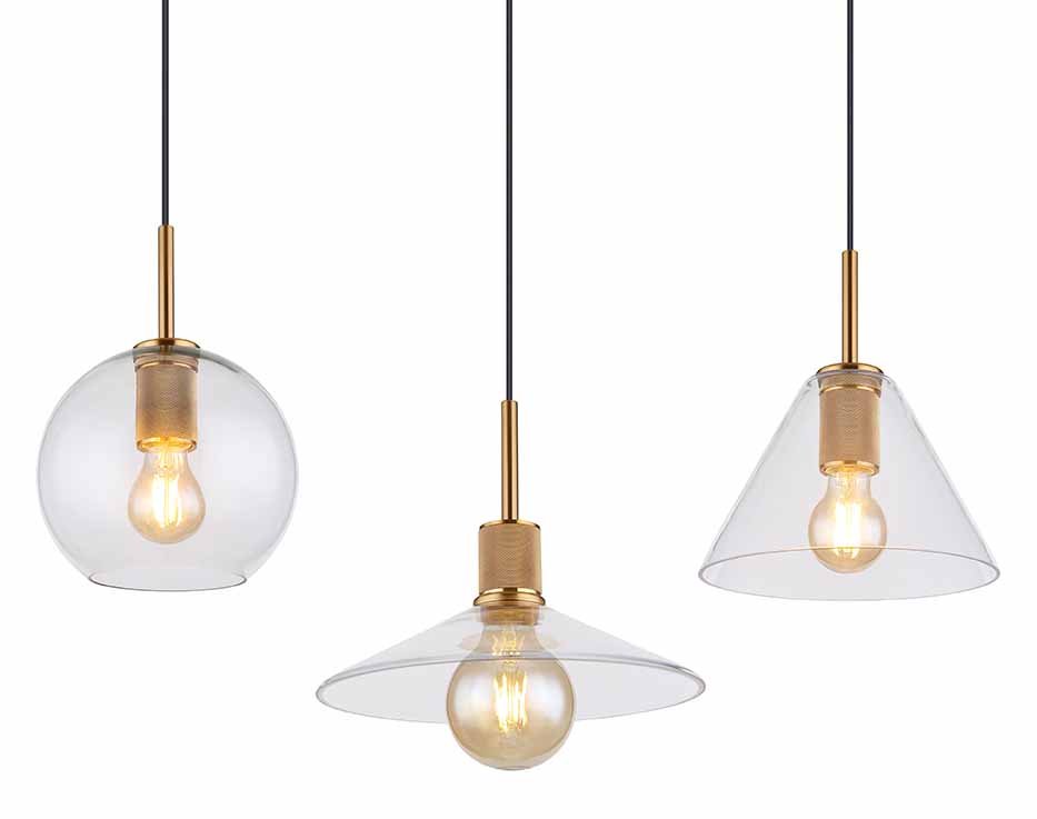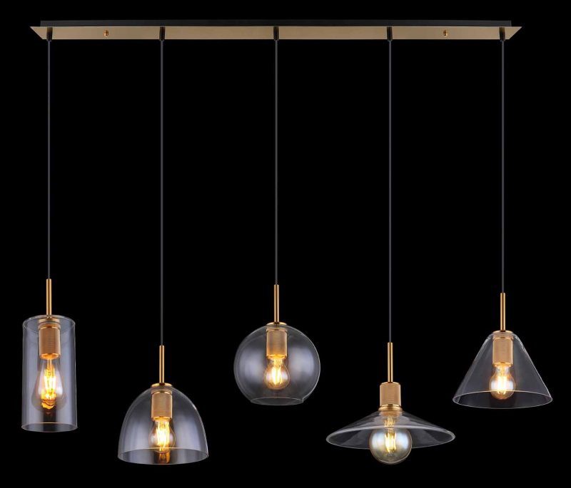 Verschönern Sie Ihren Essbereich mit der Adara-Serie Hängeleuchte aus messingfarbenem Metall, perfekt über dem Esstisch für gleichmäßige Beleuchtung. Diese 1,37 m lange Lampe ist von Gläsern in verschiedenen Formen umgeben: rund, zylindrisch und trichterförmig, und bietet Platz für fünf E27-Lampen, um die Lichtfarbe und Helligkeit nach Belieben zu steuern.