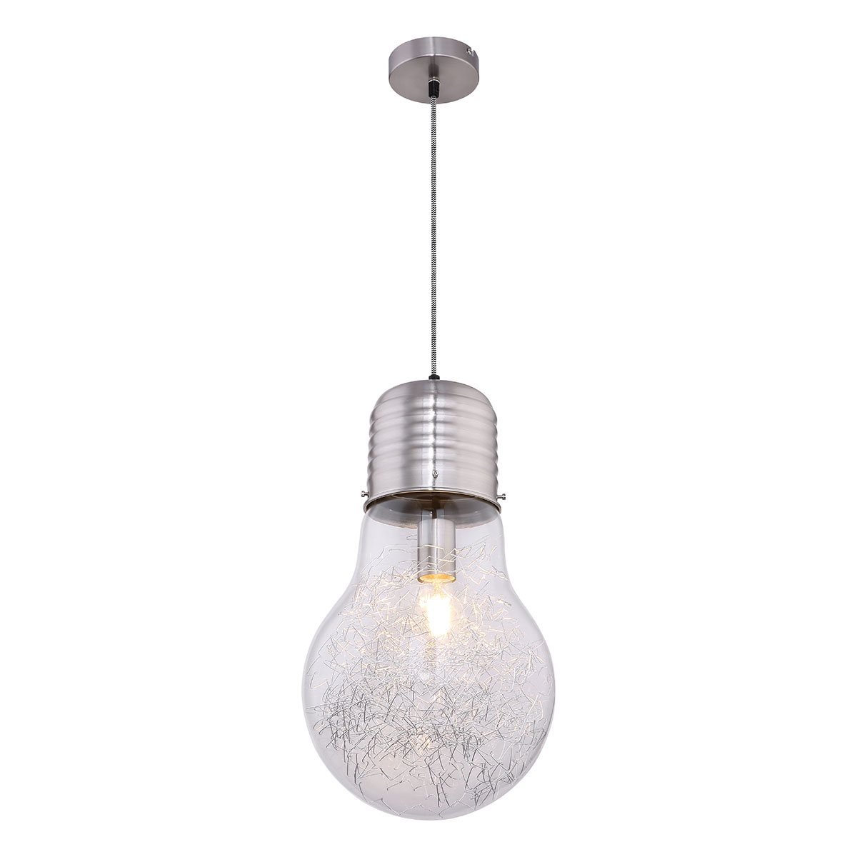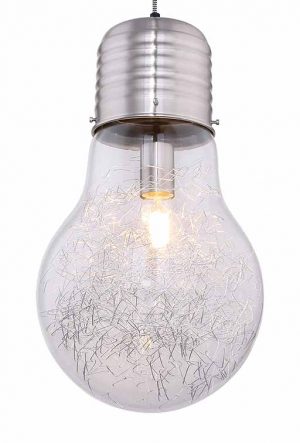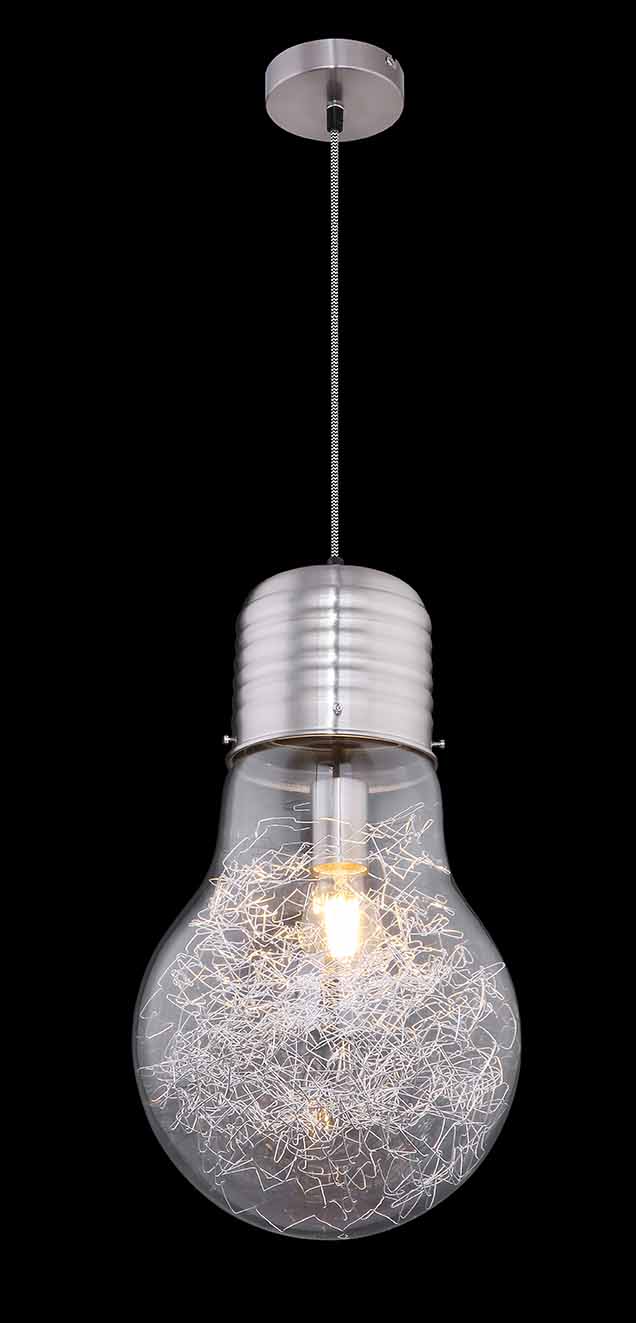 Toledo, eine Deckenleuchte von 1,35 m Höhe, fällt in jedem Raum mit ihrer nickelmatten Aufhängung und einer fast 28 cm breiten, kristallklaren Glühlampen-Simulation auf. Ein auffälliges Designelement, perfekt für moderne Interieurs.