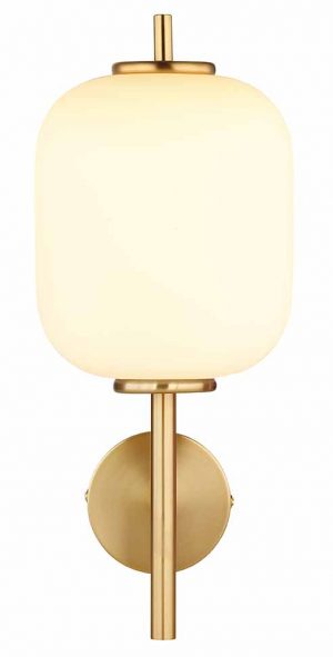 Diese Wandleuchte hat eine Breite von 135 mm, eine Höhe von 290 mm und einen Abstand zur Wand von 190 mm. Hergestellt aus messingfarbenem Metall und Opalglas, bietet sie ein nach oben gerichtetes Licht mit einer Helligkeit von 600 lm (3000K). Perfekt für jeden Raum.