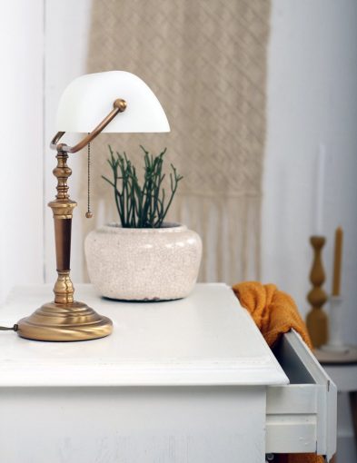 Die bronzefarbene Bankierslampe Ancilla 6186BR von Steinhauer bringt zeitlose Eleganz in jedes Interieur. Das klassische Design, kombiniert mit dem bronzefarbenen Metallrahmen und dem neigbaren weißen Glasschirm, sorgt für eine stilvolle und stimmungsvolle Ausstrahlung. Perfekt als Schreibtischlampe, Stimmungslicht oder dekorative Ergänzung für einen Arbeitsbereich oder das Wohnzimmer.