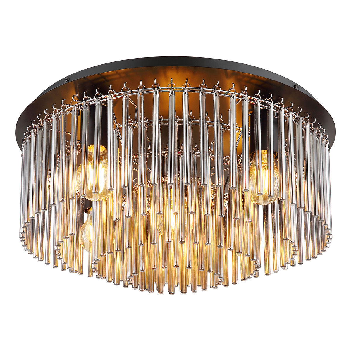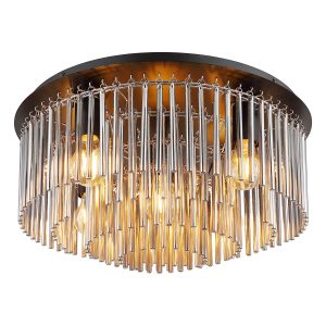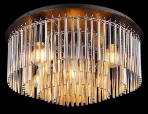 Die Deckenlampe besteht aus schwarzem matt Metall und rauchfarbenen Glasstangen, die in einem Durchmesser von 500 mm angeordnet sind. Die Leuchte benötigt 5 E27-Lampen, jeweils mit einer Leistung von bis zu 60 W und einer Spannung von 230 V. Diese Deckenlampe ist ein echter Blickfang und ideal für moderne Wohnräume. Die Kombination aus schwarzem matt Metall und rauchfarbenen Glasstangen verleiht der Lampe eine elegante Erscheinung. Die Deckenlampe hat einen Durchmesser von 500 mm und eine Höhe von 250 mm. Sie ist ideal für Räume mit hohen Decken oder als zentrales Element in einem Raum.