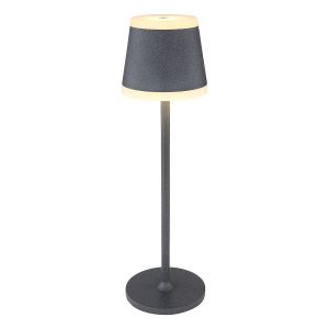 Entdecken Sie die vielseitige Schönheit der RIDLEY Tischlampe, mit einem mattschwarzen Metallgehäuse und opalisierendem Acrylschirm, der zeitlosen Charme ausstrahlt. Sie können die Helligkeit nach Ihren Wünschen mit dem Touch-Dimmer und dem Touch-An/Aus-Schalter anpassen. Diese Lampe, ausgestattet mit einem wiederaufladbaren Akku, der etwa 5 Stunden und 45 Minuten hält, ist dank der IP54-Zertifizierung sowohl für den Innen- als auch für den Außenbereich geeignet. Ausgestattet mit einer 4,6W LED-Lampe, die warmes Licht ausstrahlt, wird die RIDLEY komplett mit einem USB-Kabel und Adapter geliefert, wodurch sie eine angenehme Atmosphäre schafft, wo immer Sie sie platzieren.