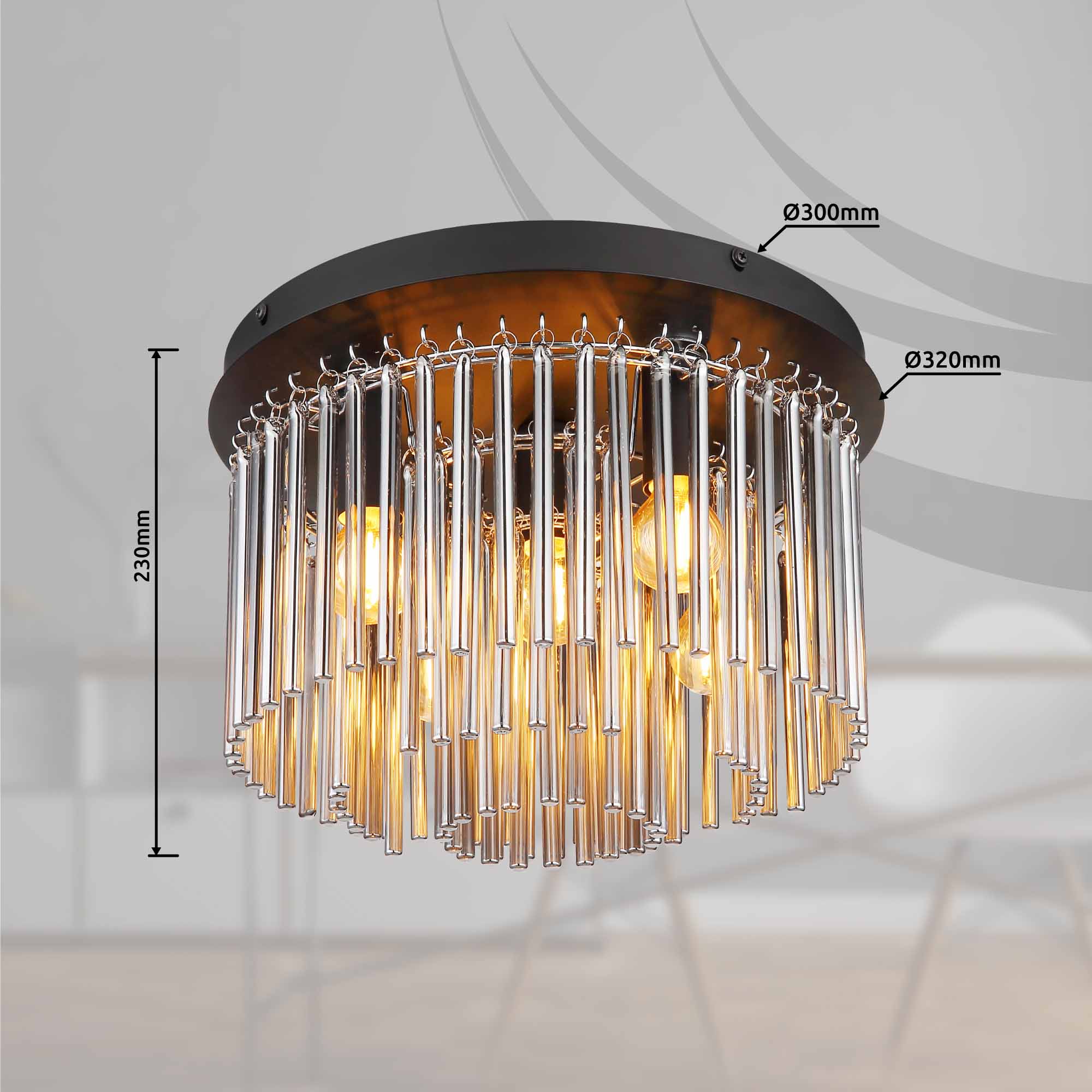 Entdecken Sie die elegante GORLEY Deckenleuchte! Das Design beeindruckt mit der Kombination aus mattschwarzem Metall, glänzendem Chrom und rauchfarbenen Glasstäben. Diese einzigartige Kombination verleiht Ihrem Raum einen Hauch von Raffinesse und Stil. Mit einem Durchmesser von 320 mm und einer Höhe von 230 mm passt die GORLEY perfekt in verschiedene Räume. Mit den E14-Fassungen können Sie selbst die Lichtfarbe und Helligkeit bis zu einer maximalen Leistung von 40 Watt bestimmen. Lassen Sie Ihrer Fantasie freien Lauf und wählen Sie die richtigen Leuchtmittel, um die Atmosphäre zu schaffen, die Sie wünschen. Holen Sie sich einzigartiges Design und angenehmes Licht mit der GORLEY Deckenleuchte nach Hause!