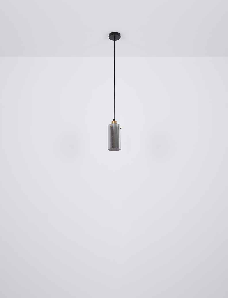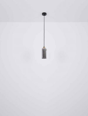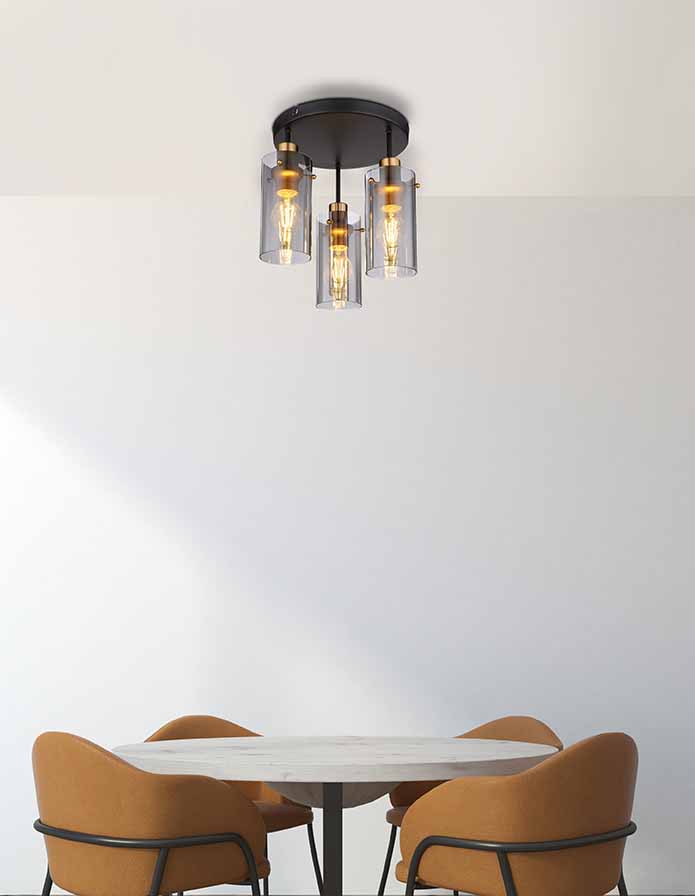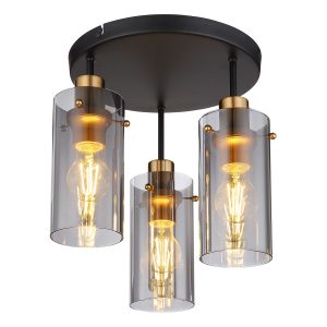Diese Deckenleuchte aus der Fanni-Serie, mit einer mattschwarzen runden Halterung (Ø30cm) und drei E27-Fassungen, ist mit eleganten zylindrischen Lampenschirmen in Rauchfarben und Messingverzierungen ausgestattet. Eine ideale Wahl für die Anpassung von Lichtfarbe und Helligkeit in Ihrem Wohnzimmer.