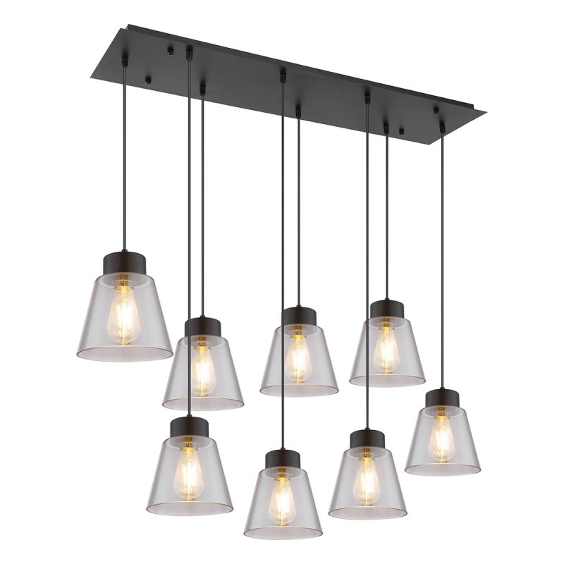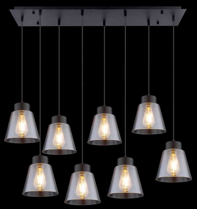 Diese Hängeleuchte aus der Gumba-Serie überzeugt mit ihrem einfachen Design aus schwarz-mattem Metall und rauchigem Glas. Sie besteht aus einer rechteckigen Metallplatte (94×24 cm), an der acht schwarze Kabel hängen. Diese sind mit trichterförmigen, rauchigen Glasschirmen (ø 19 cm) ausgestattet, die mit E27-Leuchten Ihrer Wahl bestückt werden können. Dies gibt Ihnen die Möglichkeit, die Lichtfarbe und Helligkeit individuell zu bestimmen. Darüber hinaus kann die Höhe der Hängeleuchte während der Installation auf bis zu 120 cm angepasst werden. Mit anderen Modellen der gleichen Serie können Sie eine stilvolle Atmosphäre in Ihrem Interieur schaffen und das Gesamtbild vervollständigen.