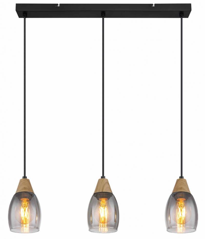<pDiese schön geformte Hängeleuchte aus der Reid-Serie beeindruckt mit ihrem wunderschönen Design. Drei schwarze Kabel von 1,2 m Länge verlaufen entlang eines schmalen Deckenarmatur (55 cm) aus schwarz mattem Metall, jedes zu einer E27 LED-Fassung, die mit schön geformten rauchfarbigen Glasabdeckungen mit Holzlook-Dekorationen ausgestattet ist. Die E27 LED-Fassungen geben Ihnen die Möglichkeit, selbst Ihre Lichtfarbe und Lichtstärke bis zu einer maximalen Leistung von 15 Watt zu bestimmen. Aufgrund der Nachhaltigkeit und Energieeinsparung empfehlen wir LED-Lampen.