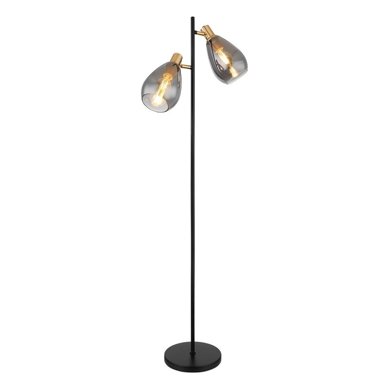 Entdecken Sie die subtile Eleganz dieser FANNI Stehlampe, die einen 1,6 m hohen schwarzen Metallstab mit einem runden Sockel kombiniert. Zwei E27 Fassungen mit stilvollen, rauchfarbigen Glaskappen bieten Flexibilität in Lichtfarbe und Helligkeit, alles steuerbar über einen einfachen EIN/AUS-Schalter. Geeignet für Lampen bis 40 Watt.