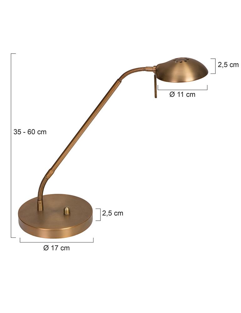 Diese klassische bronzene Tischlampe aus der Biron-Serie kombiniert zeitloses Design mit moderner LED-Technologie. Der Lampenkörper besteht aus gebürstetem bronzefarbenem Stahl und hat einen flexiblen Lesearm von 48 Zentimetern, mit dem das Licht einfach ausgerichtet werden kann. Das integrierte 8-Watt-LED-Modul bietet eine warmweiße Beleuchtung von 2700 Kelvin und eine Lichtausbeute von 650 Lumen. Für zusätzlichen Bedienkomfort ist die Lampe mit einem Drehdimmer ausgestattet. Die Fußplatte hat einen Durchmesser von 17 Zentimetern und wird mit einem Kabel von 185 Zentimetern geliefert.