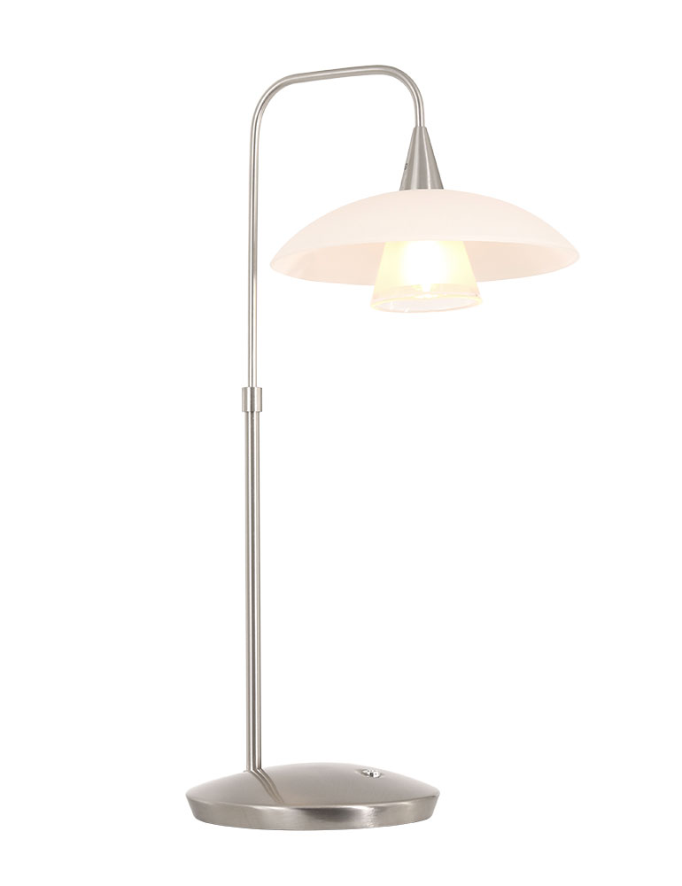 Die Tischlampe aus der Tallerken LED-Serie verfügt über einen geschmackvollen gebürsteten Stahlarm und eine weiße Glaskelch mit einer integrierten LED-Lichtquelle. Das Design sorgt dafür, dass das Licht diffus verteilt wird. Dank des integrierten Pulsdimmers am Fuß können Sie die Helligkeit einfach einstellen. Die Lampe wird mit einer 5 Watt LED-Lichtquelle mit einer Lichtausbeute von 300 Lumen und einer Farbtemperatur von 2700 Kelvin geliefert.