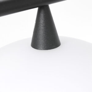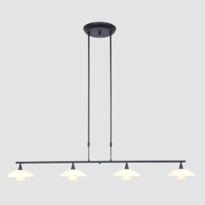 Eine runde Deckenplatte mit zwei schlichten vertikalen Stangen. Horizontal darunter eine dünne Metallplatte mit konischen Fassungen und schalenförmigen Lampen. Der moderne Rahmen mit Pulldimmer besteht aus schwarzem Metall, die Vintage-Lampen aus weißem Milchglas. Ein faszinierendes Spiel von Linien und Kontrasten, diese Tallerken 4-flammige Hängeleuchte über deinem langen Tisch. Schau dir auch die passenden Steh- und Tischlampe an.