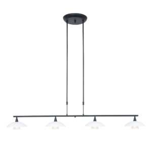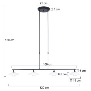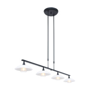 Die 4-flammige Hängeleuchte aus der Tallerken LED-Serie kombiniert schlichtes Design mit funktionaler Beleuchtung. Der Leuchtenkörper ist aus Stahl gefertigt und in mattschwarz ausgeführt. Die weißen Gläser Schalen enthalten jeweils einen weißen Glaszylinder, um Blendung zu vermeiden. Die Höhe ist von 80 cm bis maximal 120 cm verstellbar. Ausgestattet mit vier LED-Lichtquellen von 3 Watt mit einem Lichtstrom von 300 Lumen pro Stück und einer warmen Lichtfarbe von 2700 Kelvin. Die Lampe ist dimmbar mit einem integrierten Pushdimmer.