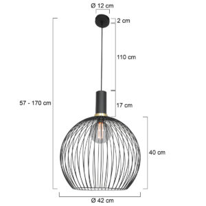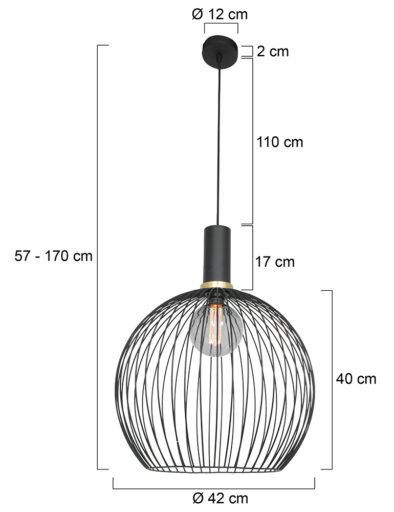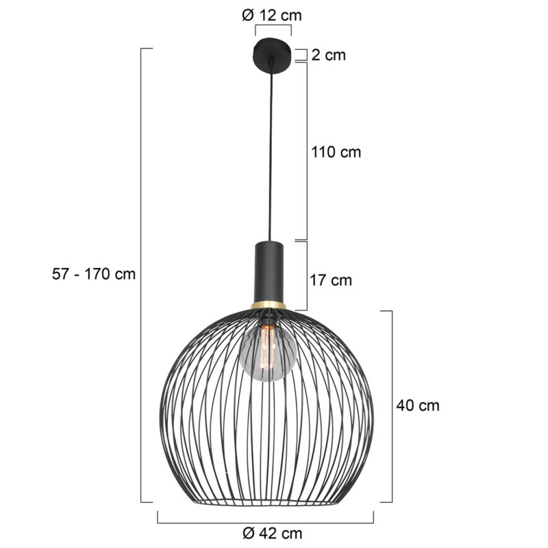 Die Aureole 45 cm Hängeleuchte kombiniert modernes Design mit einem luxuriösen Erscheinungsbild. Der offene, kugelförmige Schirm besteht aus schwarzen Metalldrähten, und der goldene Ring an der Oberseite verleiht eine elegante Note. Sie ist mit einer E27-Fassung ausgestattet und geeignet für Lichtquellen bis 40 Watt. Die Höhe ist bis zu 170 cm verstellbar, sodass du sie in der gewünschten Höhe aufhängen kannst. Die Lampe wird mit einem schwarzen und einem goldenen Ring geliefert, sodass du die Optik anpassen kannst. Dimmbaar in Kombination mit einem Wandschalter und einer geeigneten Lichtquelle.