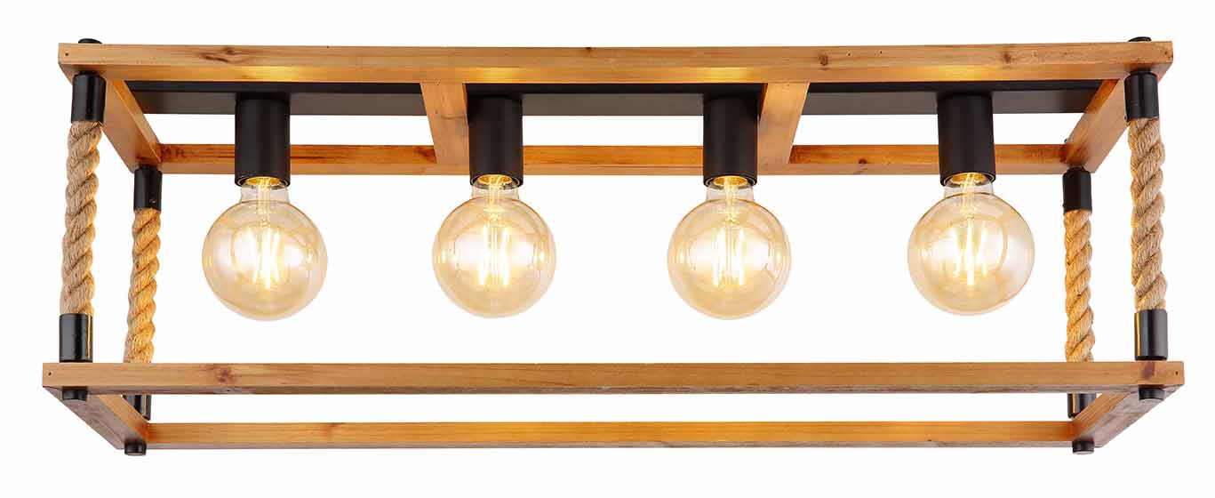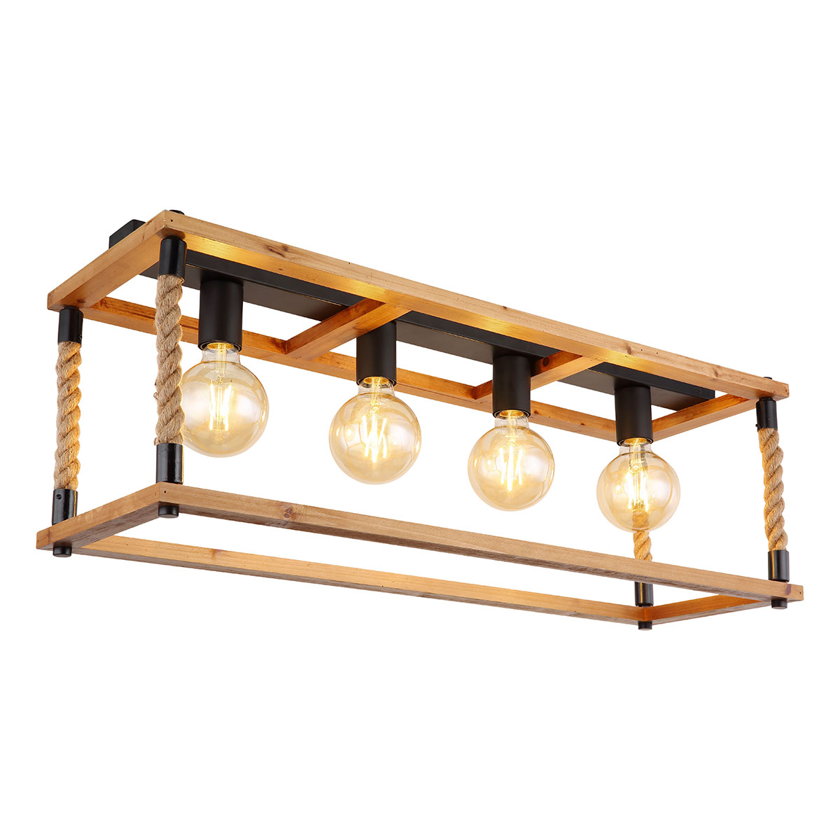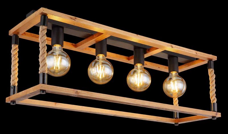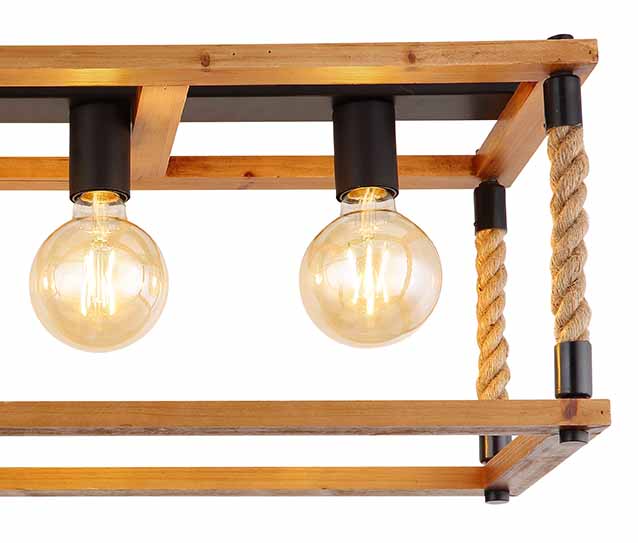 Diese wunderschöne Deckenlampe beeindruckt mit ihrem großartigen Design. In einem Holzrahmen von 80×25 cm mit Dekorationen aus Hanfseil befinden sich 4 E27-Fassungen, die mit einer mattschwarzen Metallstange an der Decke befestigt sind. Mit den E27-Fassungen können Sie Ihre Lichtquelle frei wählen, bis zu einer maximalen Leistung von 60 Watt.