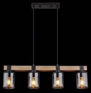 Diese wunderschöne Hängeleuchte inspiriert mit einem fantastischen Design. Zwei schwarze Kabel verlaufen von einer schmalen Deckenhalterung zu einem 73 cm langen Holzkoffer. Auf dem Holzrahmen befinden sich vier E27-Fassungen, jeweils mit einem rauchfarbenen Schirm in Zylinderform (Ø10 cm). Dank der freien Wahl der Lichtquellen können Sie selbst die Lichtfarbe oder Lichtstärke bis zu einer maximalen Leistung von 60 Watt bestimmen. Setzen Sie neue Akzente in Ihrem Raum.