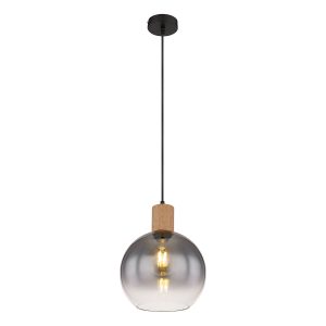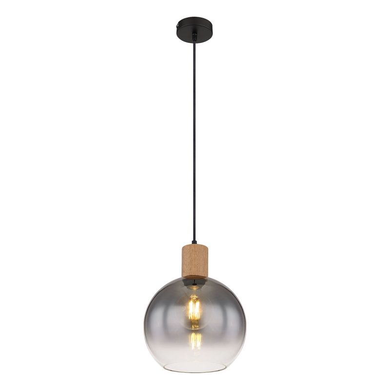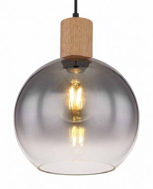 <pDiese großartige Pendelleuchte inspiriert mit modernem Design. Ein schwarzes Kabel von 1,2 m Länge ragt aus einer runden Deckenhalterung, die an einer E27-Buchse mit wunderschönen Holzdekorierungen endet. Diese E27-Buchse ist in Rauchfarben gehüllt durch einen wohlgeformten runden Glasschirm und gibt Ihnen die Möglichkeit, über Lichtfarbe und Helligkeit bis zu einer maximalen Leistung von 40 Watt zu entscheiden.